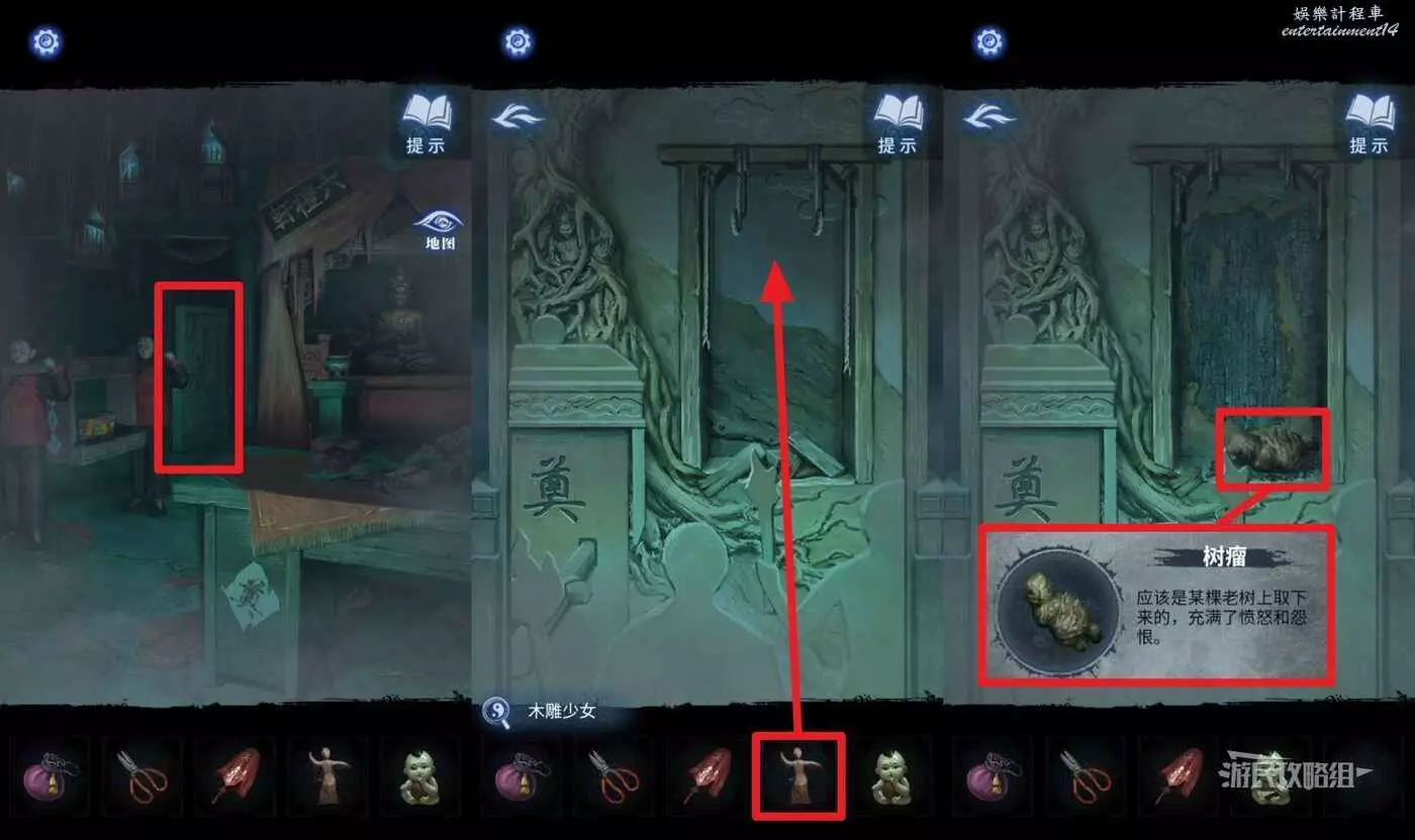 打開地圖返回【六禮軒】,點擊抬轎小人後方的屏風,選擇道具欄中的【木雕少女】放在屏風上方的架子上,拾取【樹瘤】。