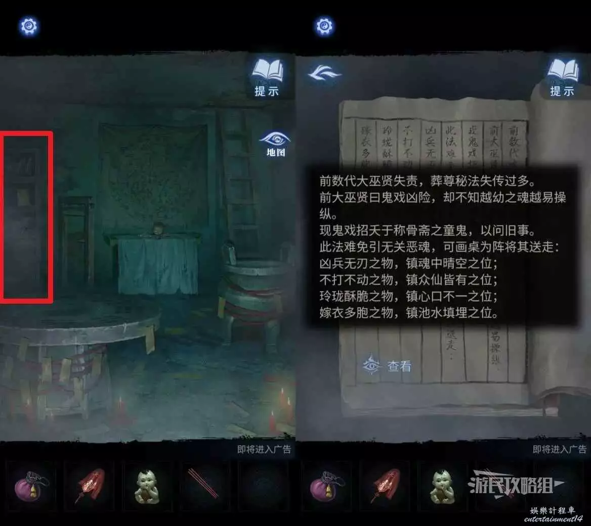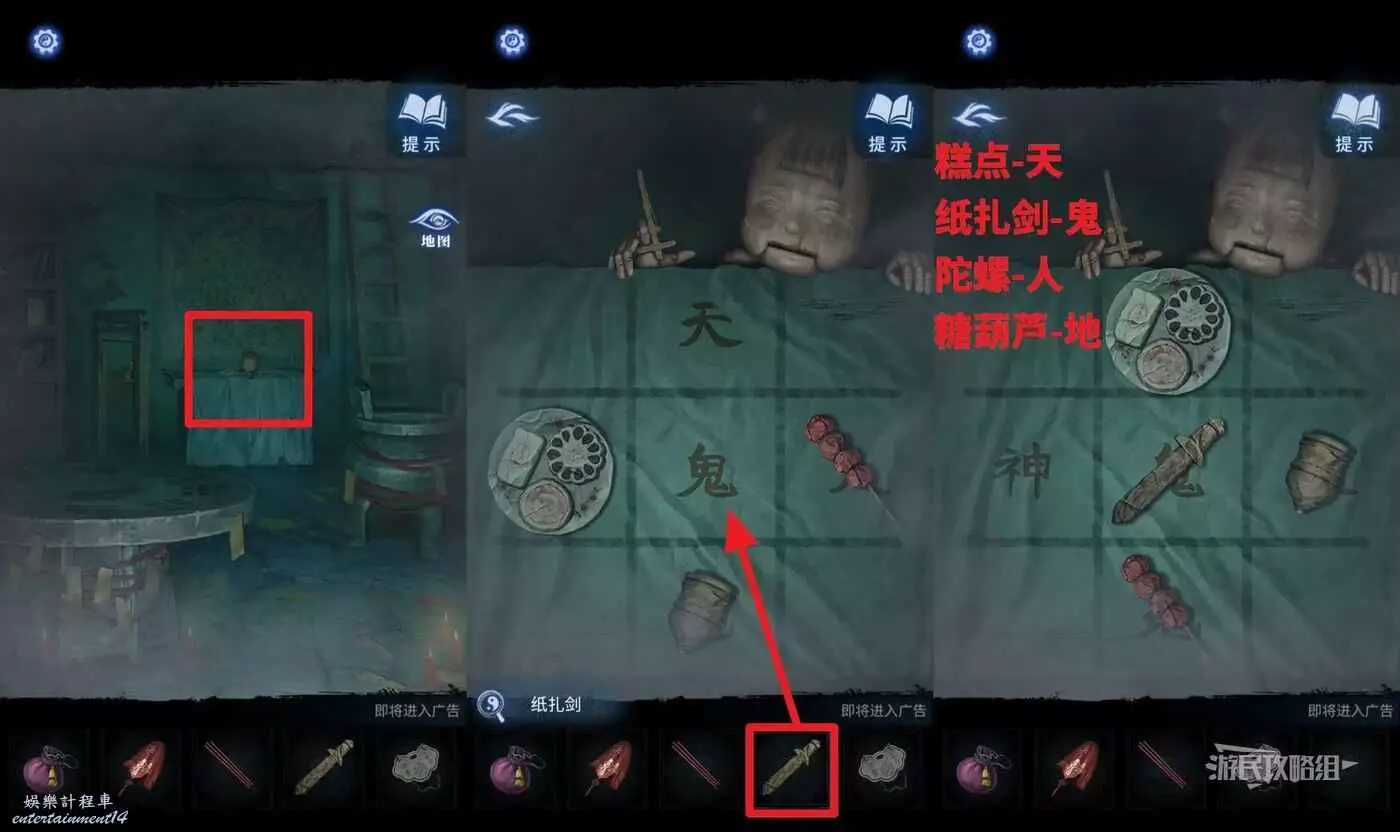點擊秤桿右側的桌子,在道具欄選擇【紙紮劍】放入桌上的法陣中,根據之前在書架上獲得的線索開始解謎,本謎題為字謎,通過每一句話獲得一個的字,再把對應的物品放在正確的字上即可。