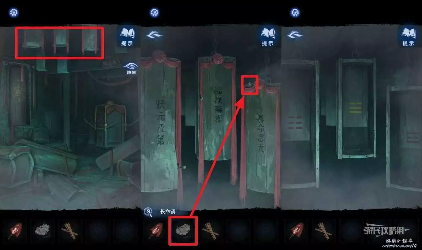 前往【喜送閣】,點擊房頂吊著的棺材,選擇道具欄中的【長命鎖】掛在最右側棺材的釘子上,獲得八卦的線索。