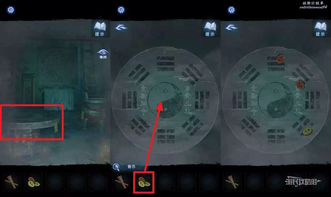 打開地圖前往【稱骨齋】,點擊左側的桌子,在道具欄選擇【骨幣】放在桌子上,獲得八卦的顏色線索。