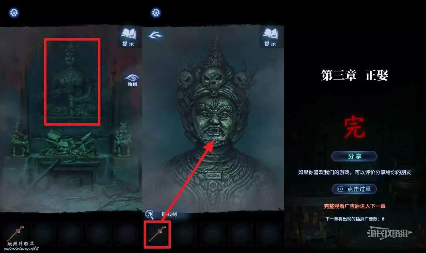 打開地圖前往【奉奘祠】,在道具欄使用【銅錢劍】連續點擊六葬菩薩雕像,觸發劇情,第三章完。