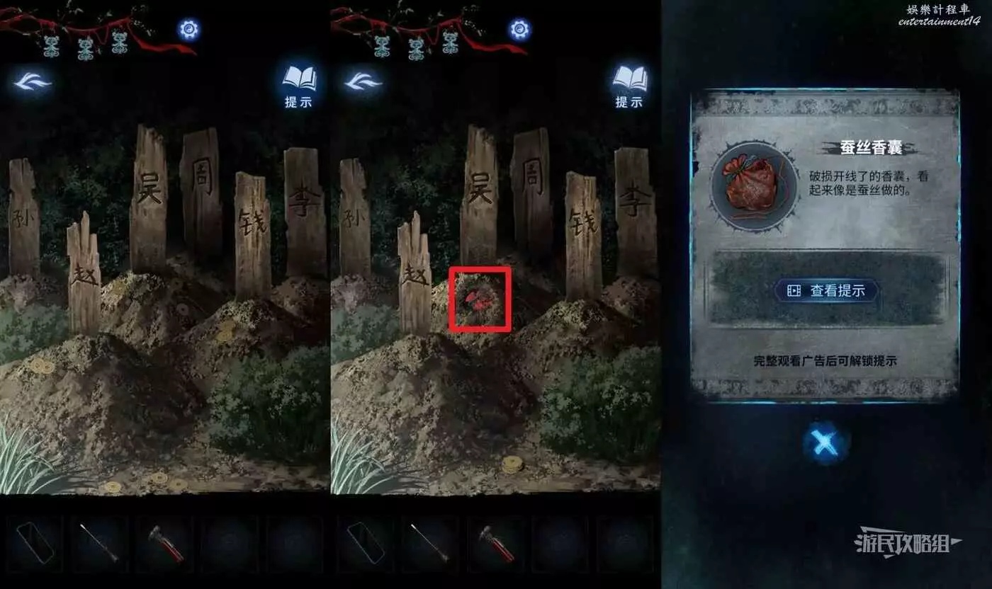 【聶莫琪視角】解開墓碑貢品謎題後,紅霧散去,點擊畫面右側有空洞的墓碑,在道具欄選擇【玉雕】放入空洞,拾取【大銅錢】和【布帶】。