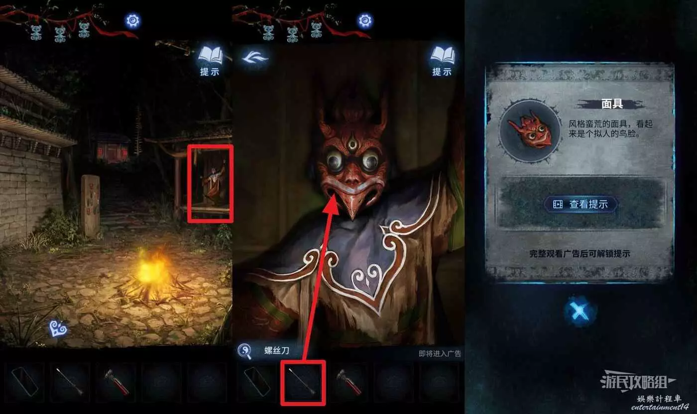 回到篝火區域,點擊左側掛著面具的石碑,在道具欄選擇【面具】把它掛在石碑上,開啟左側建築大門(注意有音效小高能)。