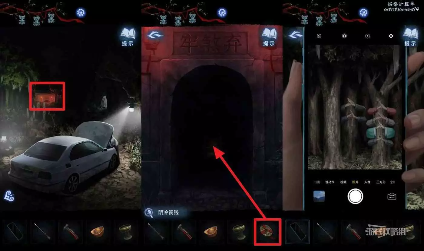 返回寧子服和車所在區域,點擊遠處的【棄煞牢】,在道具欄選擇【陰冷銅錢】吸走煞氣。先不要進去,重新用手機拍綠色樹林可以獲得新線索。