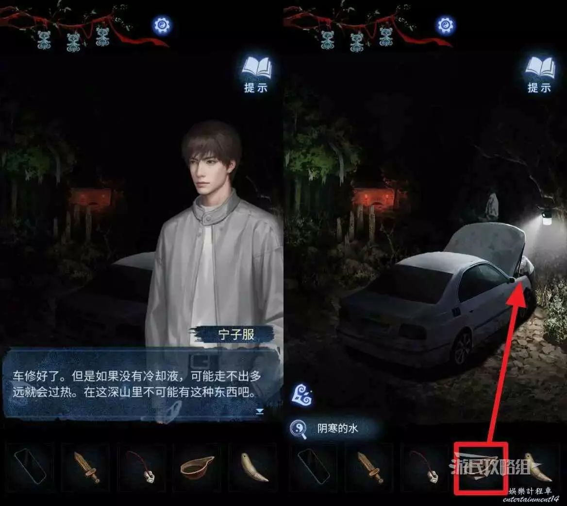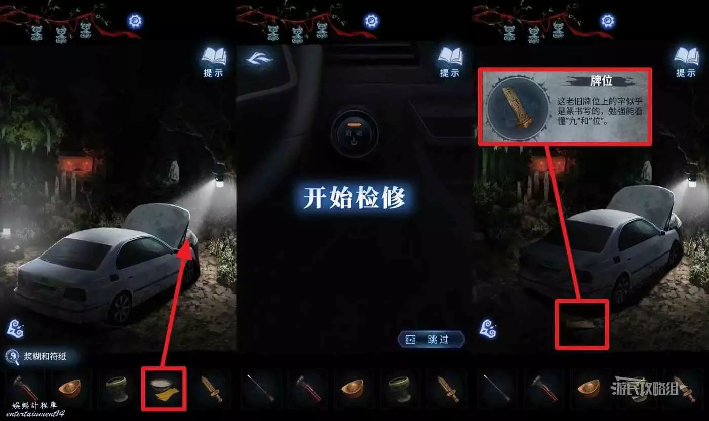 離開棄煞牢,返回車邊,在道具欄選擇【漿糊和符紙】交給寧子服。開啟修車小遊戲,需要在下方指標進入藍色區域時按下按鈕,如果嫌麻煩可以直接跳過。完成檢修後觸發劇情,看完劇情,可以在車後輪下方拾取【牌位】。