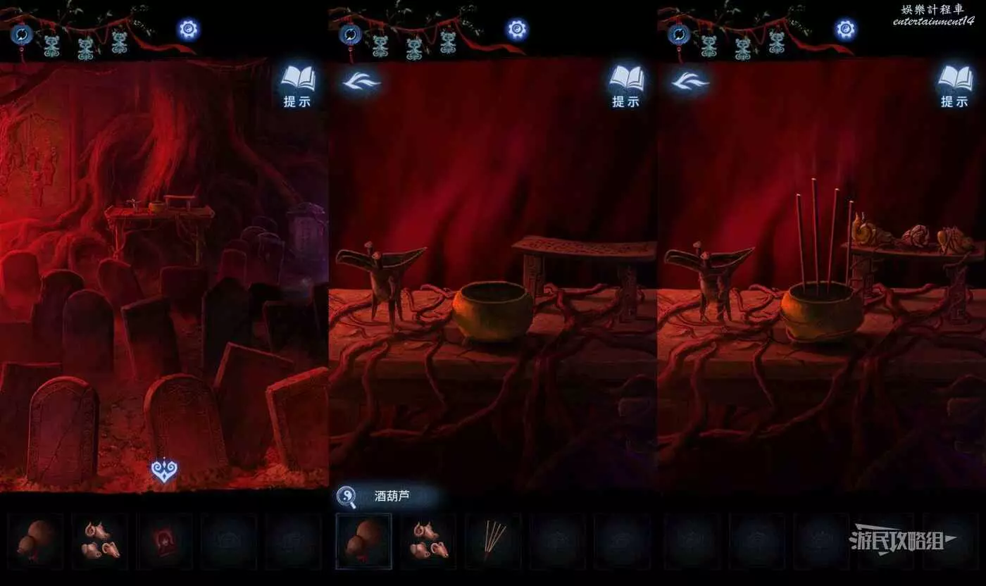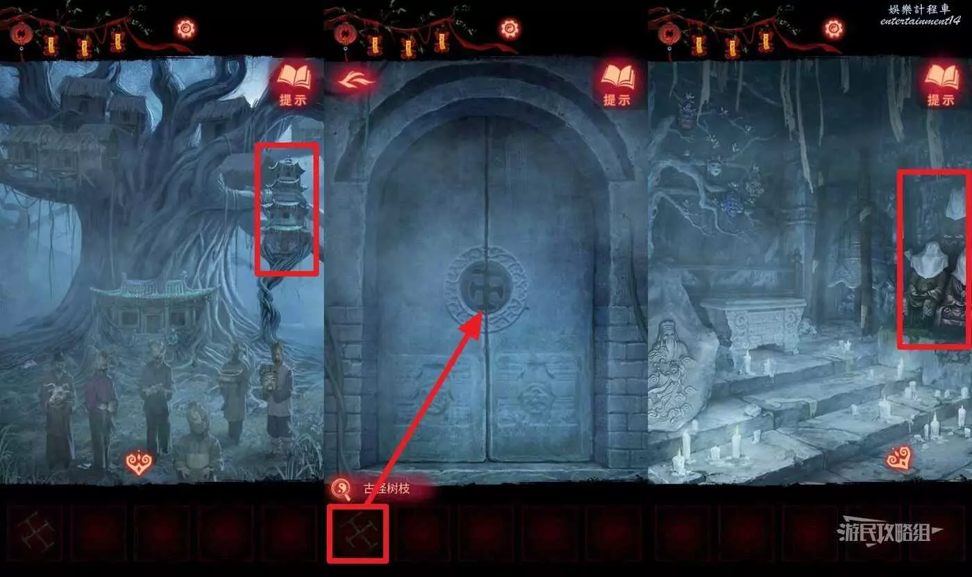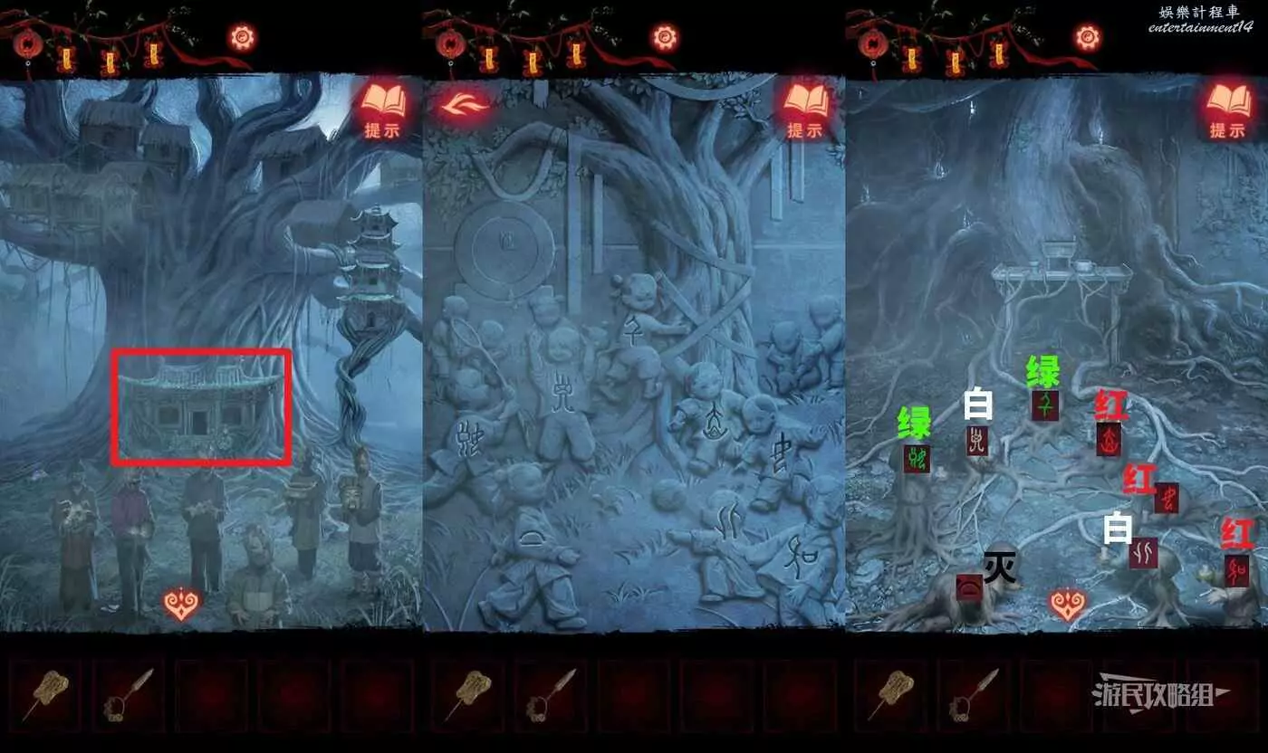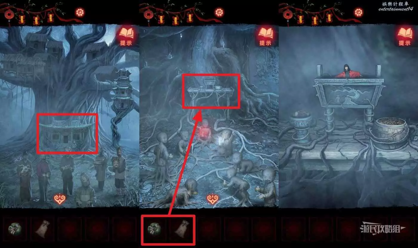 【聶莫黎視角】拿到貢品謎題線索後,切換到聶莫黎視角,點擊畫面下方箭頭切換到樹根區域,解開貢品謎題。觀察五個村民的站位發現與聶莫琪那邊是鏡像,因此手中的貢品也需要鏡像放置,因此自左至右應該是【牛頭-葫蘆-葡萄-香爐-人頭】。