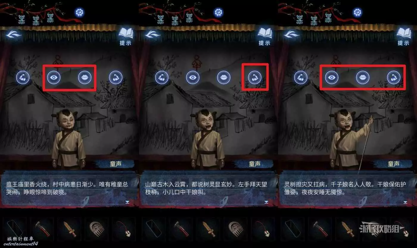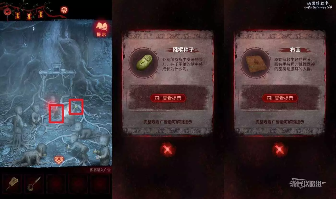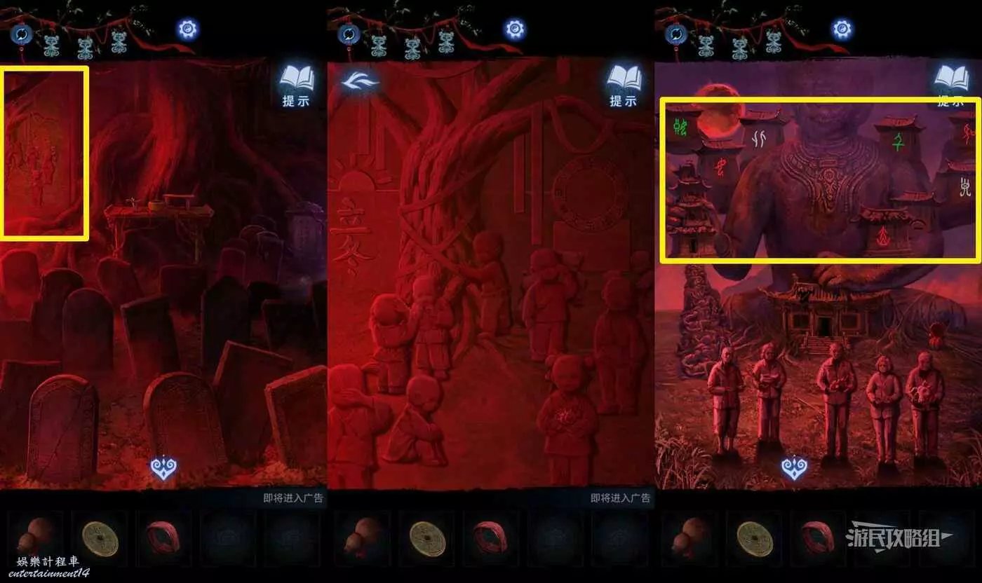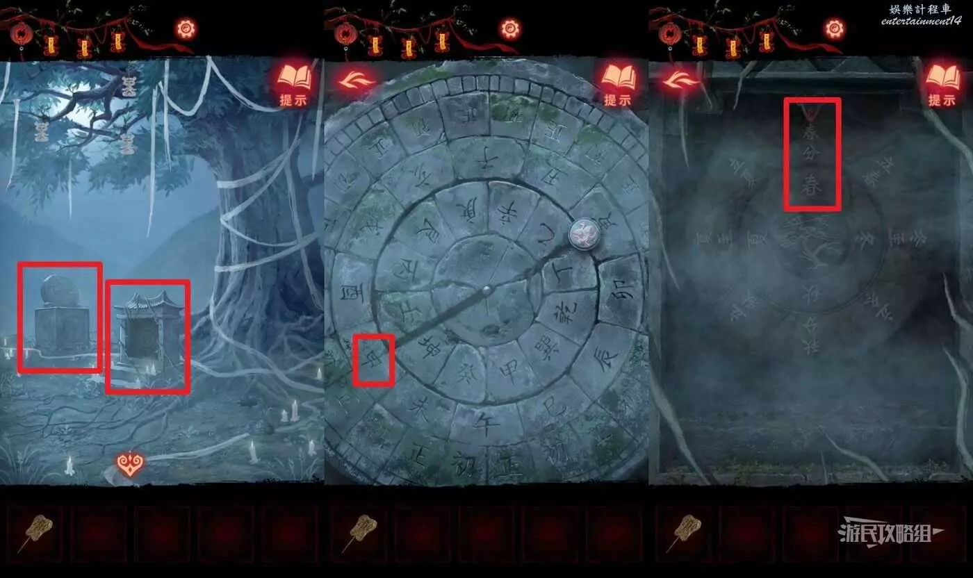 【聶莫黎視角】拿到貢品謎題線索後,切換到聶莫黎視角,點擊畫面下方箭頭切換到樹根區域,解開貢品謎題。觀察五個村民的站位發現與聶莫琪那邊是鏡像,因此手中的貢品也需要鏡像放置,因此自左至右應該是【牛頭-葫蘆-葡萄-香爐-人頭】。