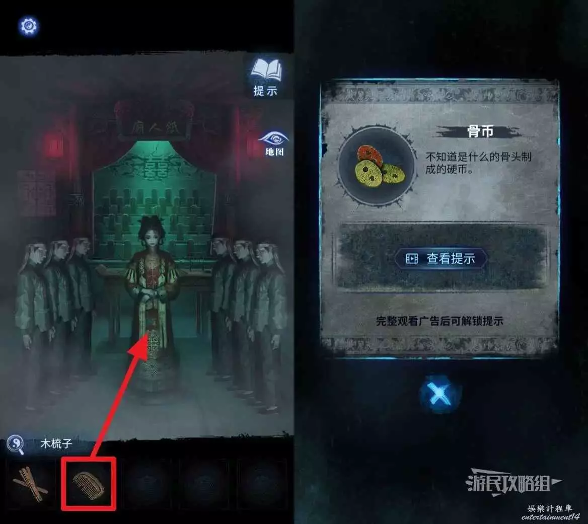 打開地圖前往【紙人廟】,在道具欄選擇【木梳子】交給魕娘子,獲得【骨幣】。