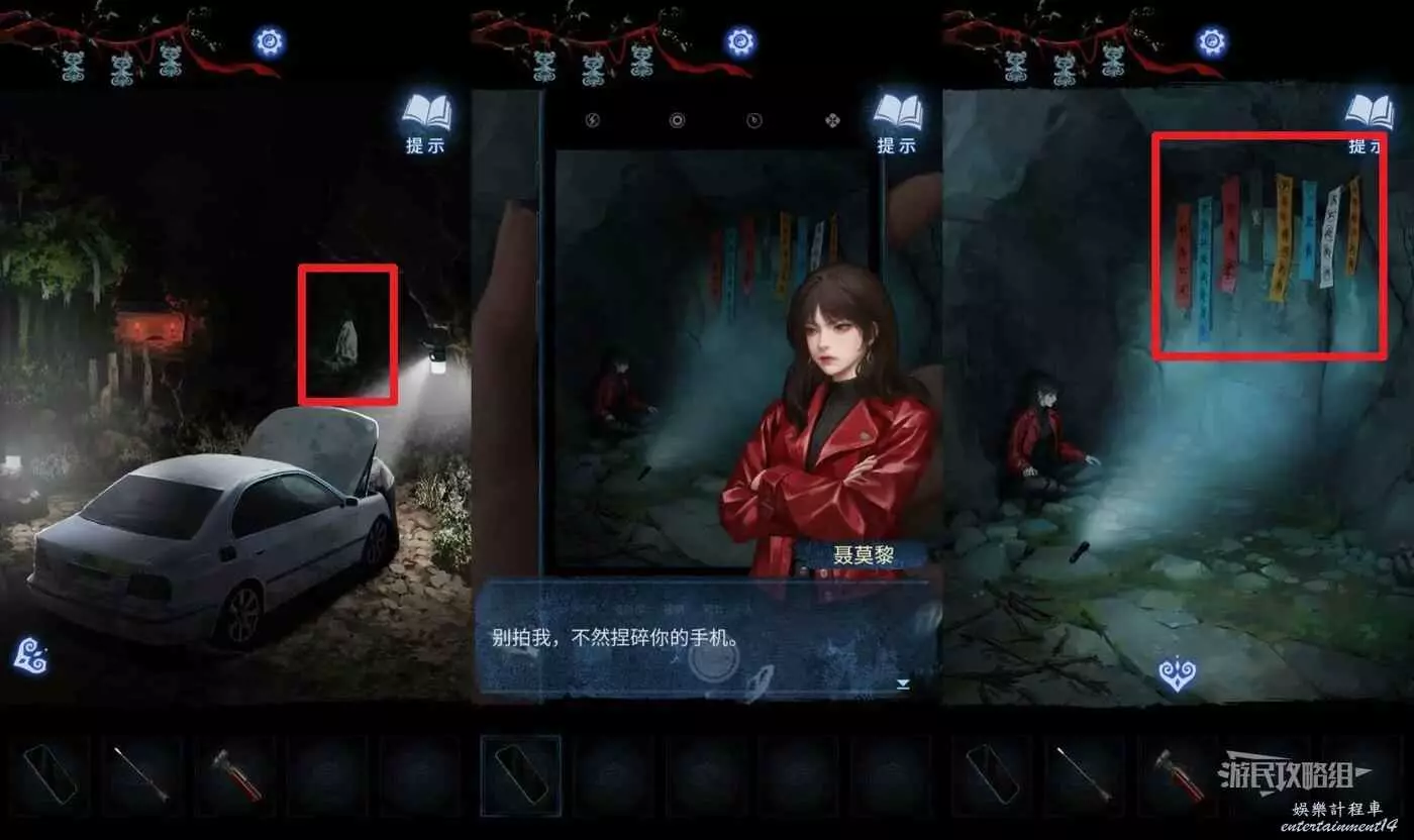 看完劇情後進入第四章,此時點擊右側【山洞】,用手機照聶莫黎的話會觸發有趣的台詞。記住右上方布條的線索。
