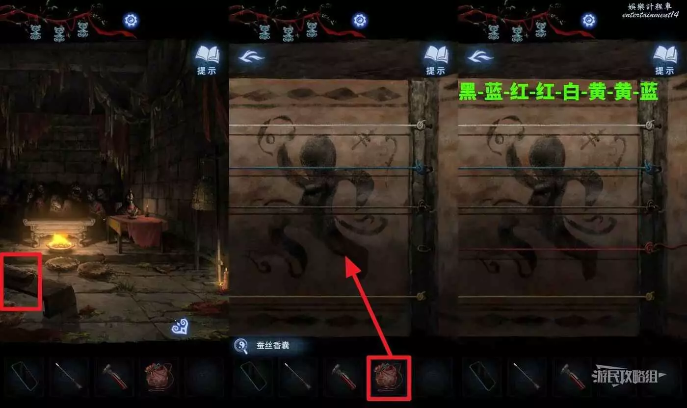 進門之後,點擊房間左側的古琴,根據之前聶莫黎所在山洞中掛著布條的顏色和上面圖案的數量得到對應的線索: