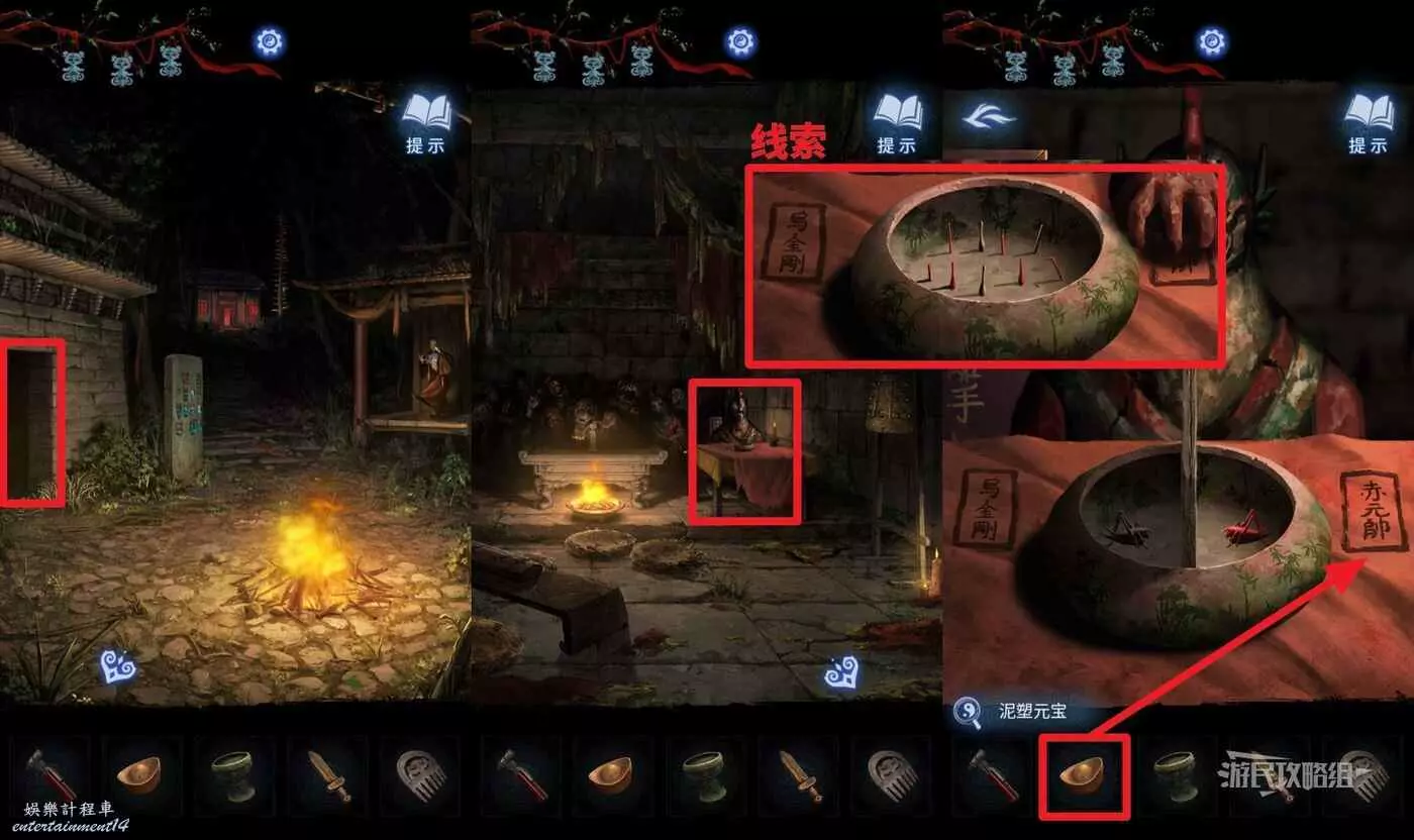 點擊篝火左側牆上的門進入房間,點擊房間右側鋪紅布的桌子,在道具欄選擇【泥塑元寶】放在右側桌子上,獲得香爐線索。