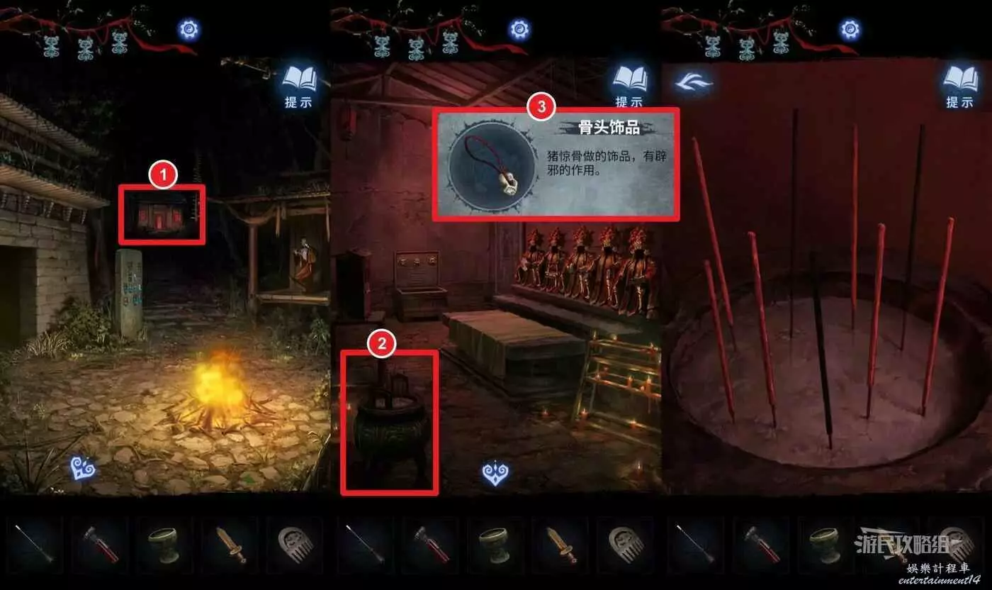 然後進入篝火區域樓梯上方亮紅燈的房子,點擊房間左側的香爐,根據剛才的線索將對應的香點成紅色,獲得【骨頭飾品】。