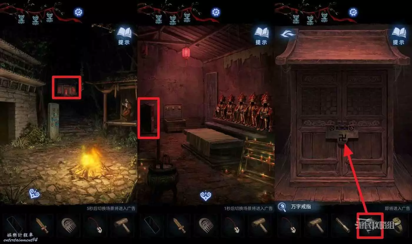 離開棄煞牢回到篝火區域,前往樓梯上方亮紅燈的屋子,點擊左側的櫃子,在道具欄選擇【萬字戒指】打開第一道門。