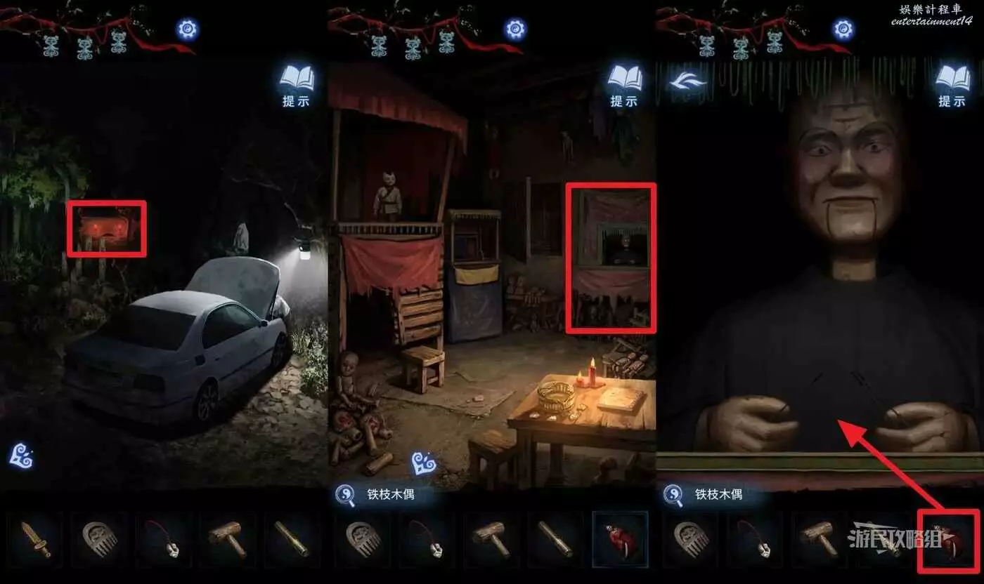 回到車旁邊進入棄煞牢,點擊右側有大木偶的戲台,在道具欄選擇【鐵枝木偶】放入戲台。