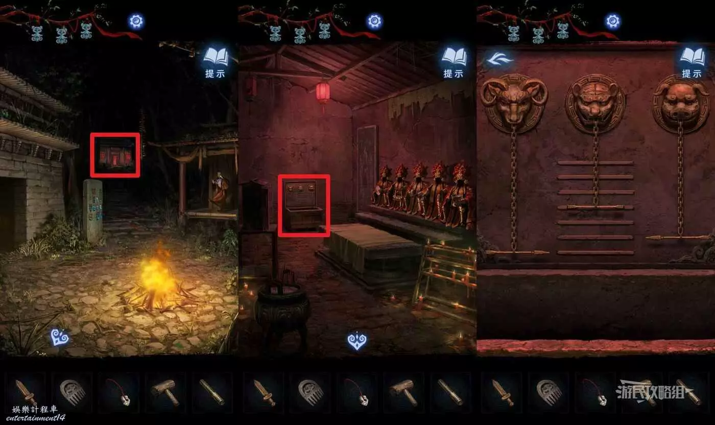 根據梳子上的標點或圖案/漢字數,獲得羊、虎和豬的數量。前往篝火區域樓梯上方亮紅燈的房子,點擊房間中間有銅像的箱子,按照剛才的數位拉動三個銅環下方的鏈子,指向正確的橫杠。從左到右依次為7、4、6。