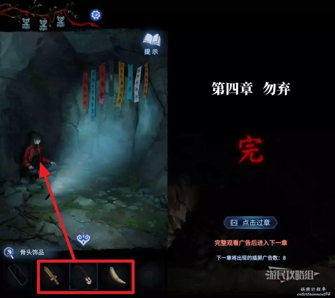 進入山洞,分別將【小桃木劍】、【骨頭飾品】和【獸牙飾品】交給聶莫黎,離開山洞,觸發大段劇情,第四章完。