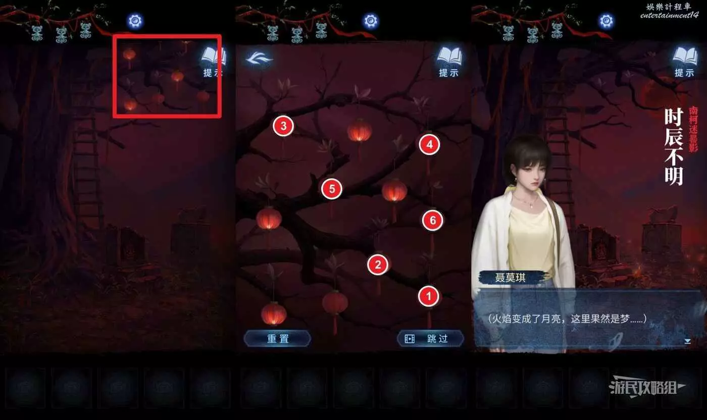 看完劇情後進入第五章,點擊畫面右上角的燈籠,開始燈籠謎題,需要將所有的燈籠全點亮,點的順序可以參考下圖,如果嫌麻煩可以直接跳過。