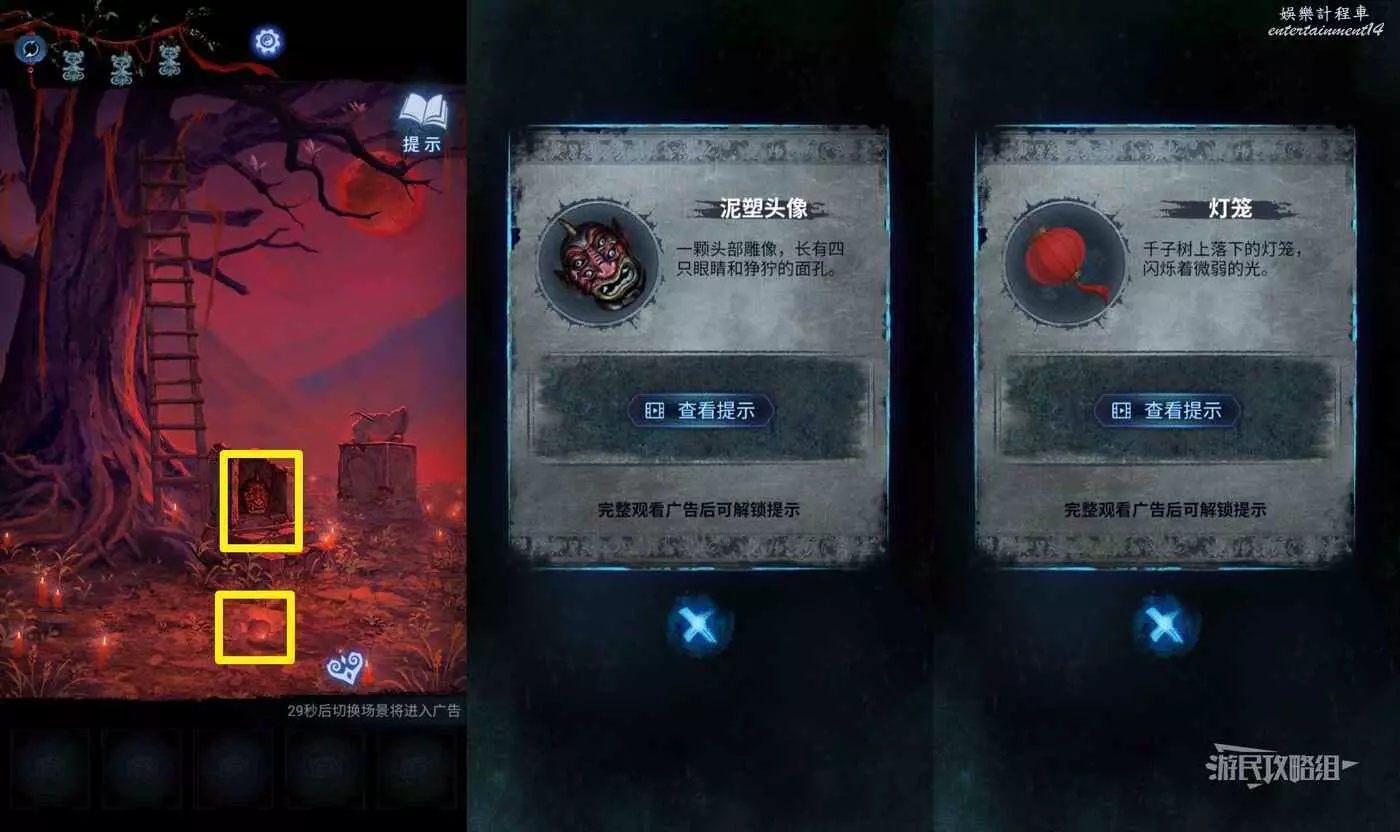 【聶莫琪視角】返回聶莫琪視角,在千子樹下拾取【泥塑頭像】和【燈籠】。