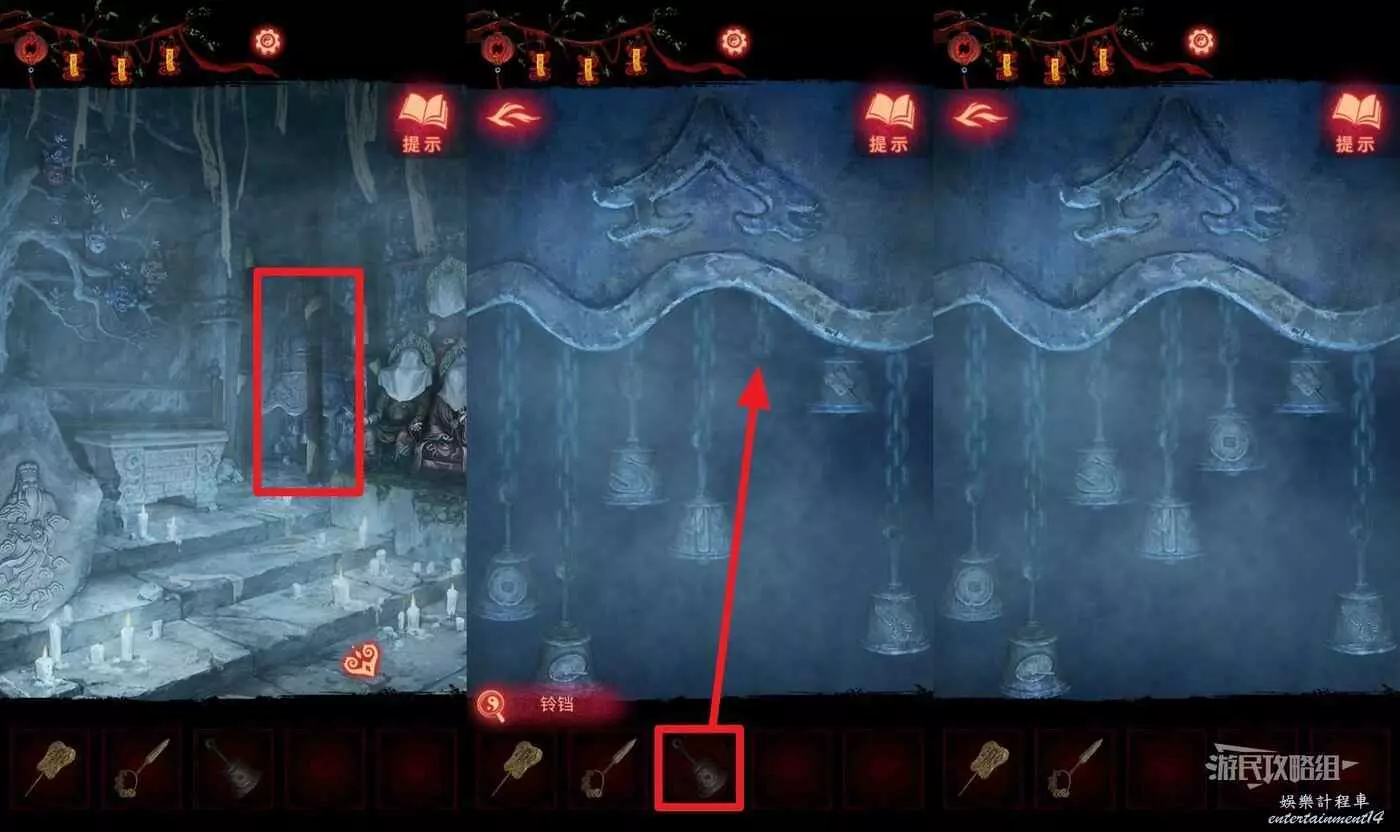 【聶莫黎視角】再次進入塔內,點擊畫面中間的大鐘,在道具欄選擇【鈴鐺】放在沒有鈴鐺的鐵鍊上,獲得鈴鐺圖案線索。