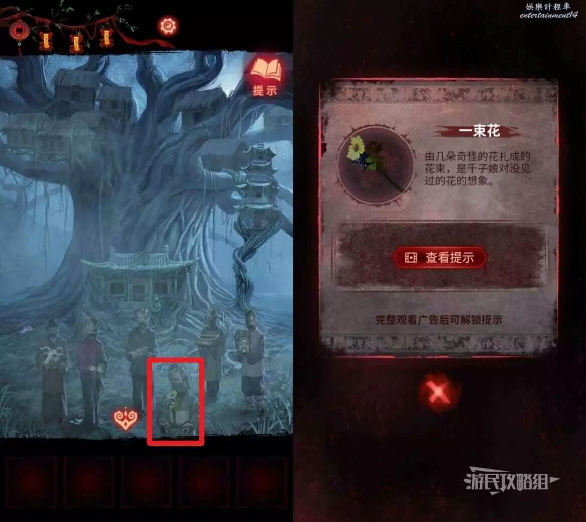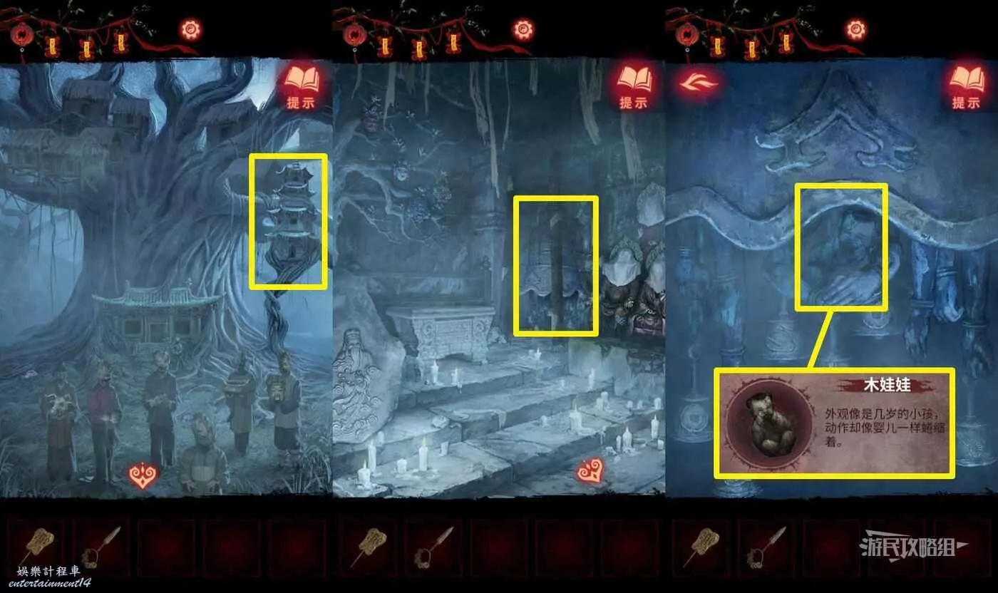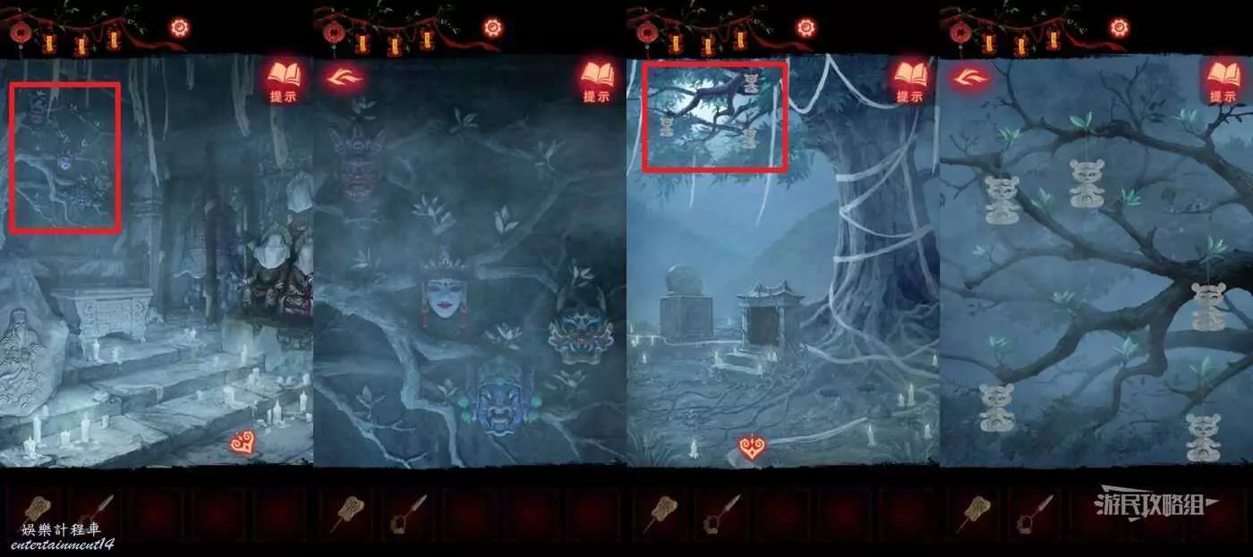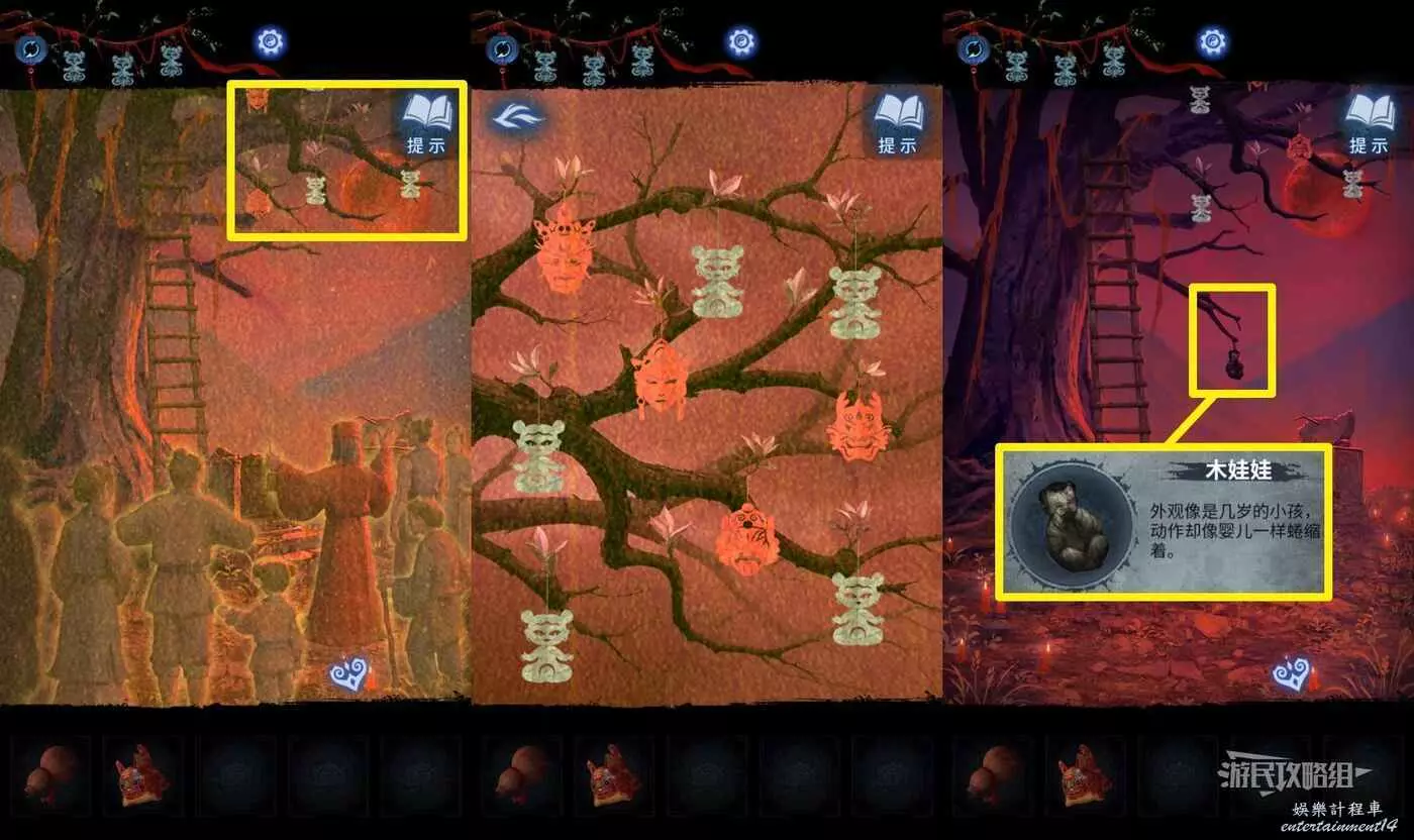 【聶莫黎視角】再次點擊塔內左側樹枝,獲得面具擺放位置線索;回到塔外樹幹區域,點擊樹枝獲得紙娃娃擺放位置線索。