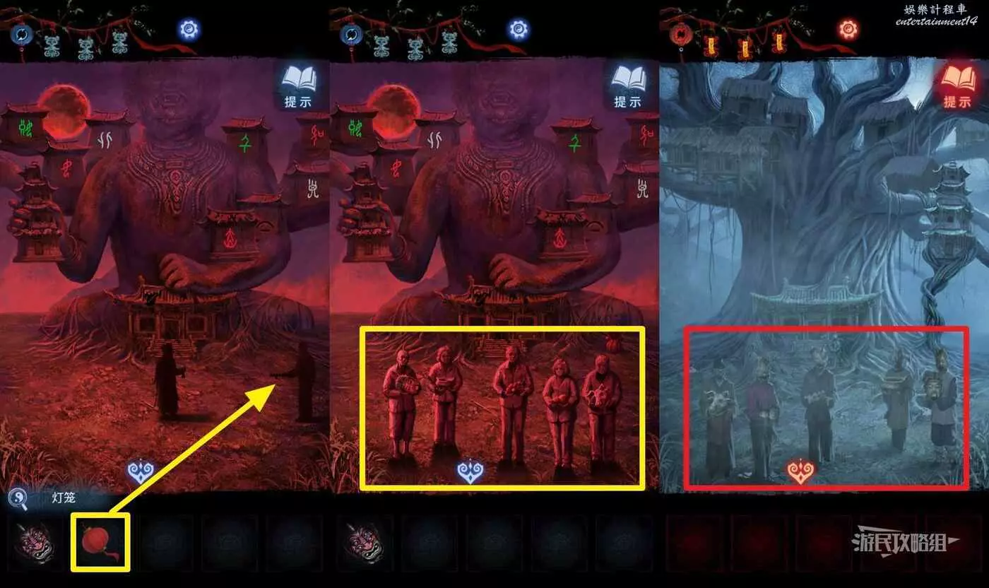 【聶莫琪視角】點擊畫面下方箭頭切換到六葬雕像區域,在道具欄選擇【燈籠】放在畫面右側村民手上,觸發劇情(注意有連續小高能),看完劇情後獲得貢品謎題線索。