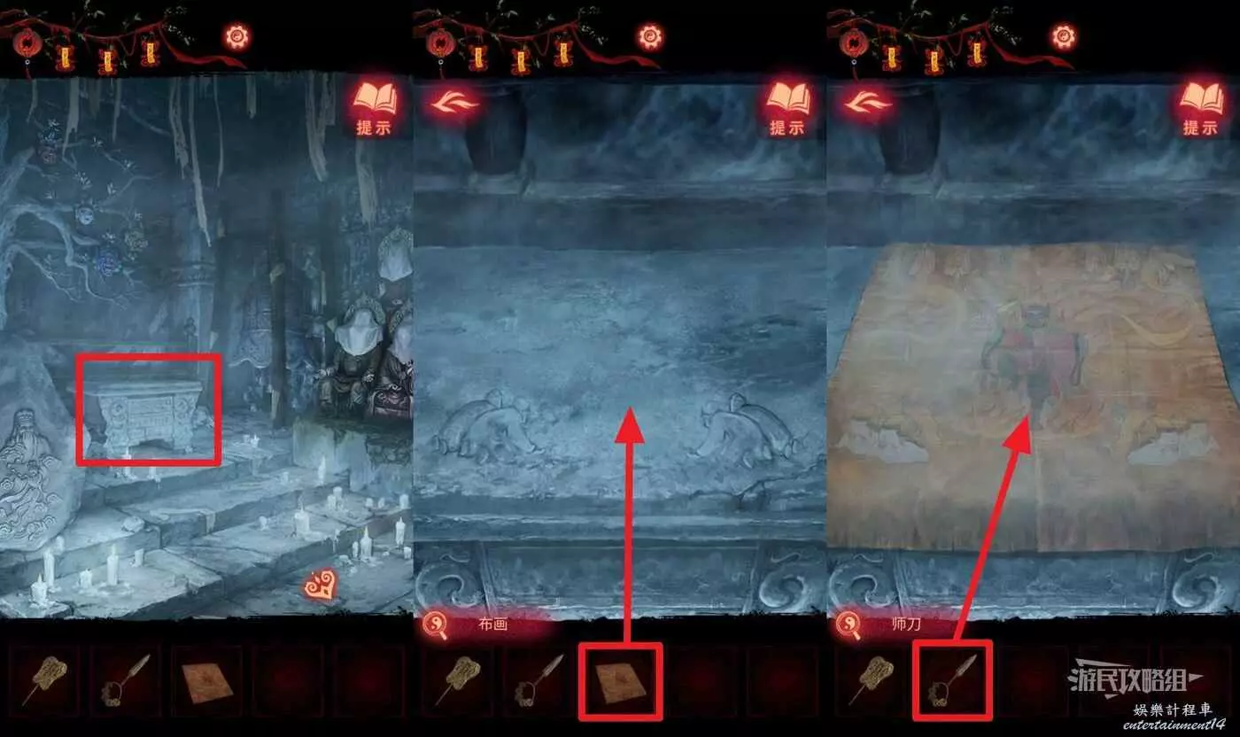 【聶莫黎視角】進入塔內之後,點擊畫面中間的供台,在道具欄選擇【布畫】放上供台,再選擇【師刀】點擊布畫。