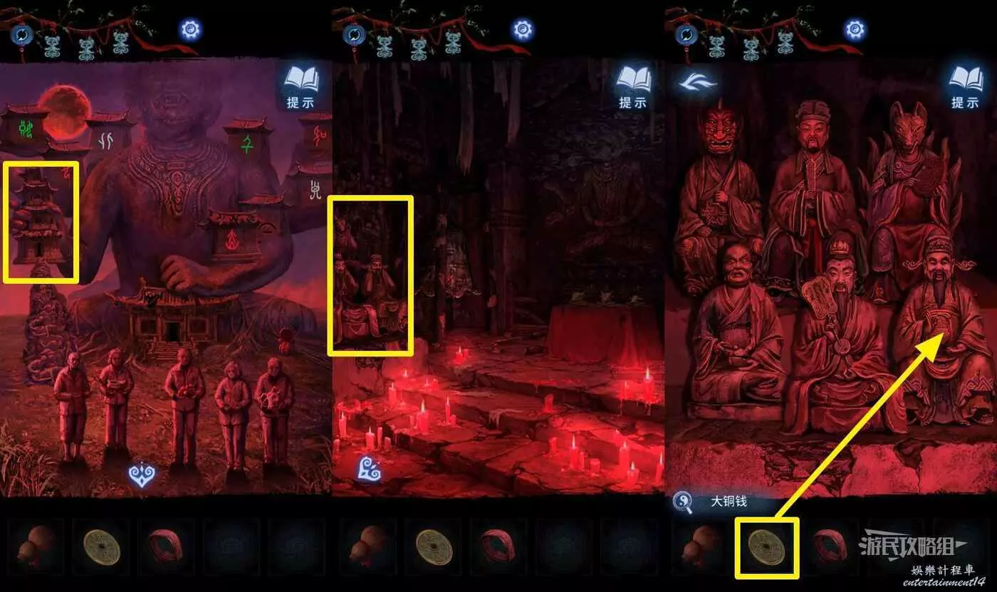 【聶莫琪視角】切換到聶莫琪視角,進入六葬雕像左側的塔內,點擊畫面左側的雕像,在道具欄選擇【大銅錢】放入右下角雕像手中。