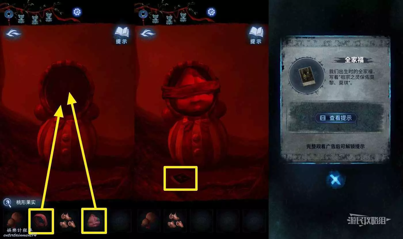 【聶莫琪視角】在道具欄中依次選擇【桃形果實】和【布條】放在不倒翁上,獲得【全家福】。