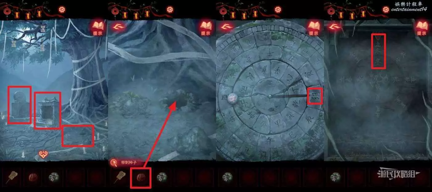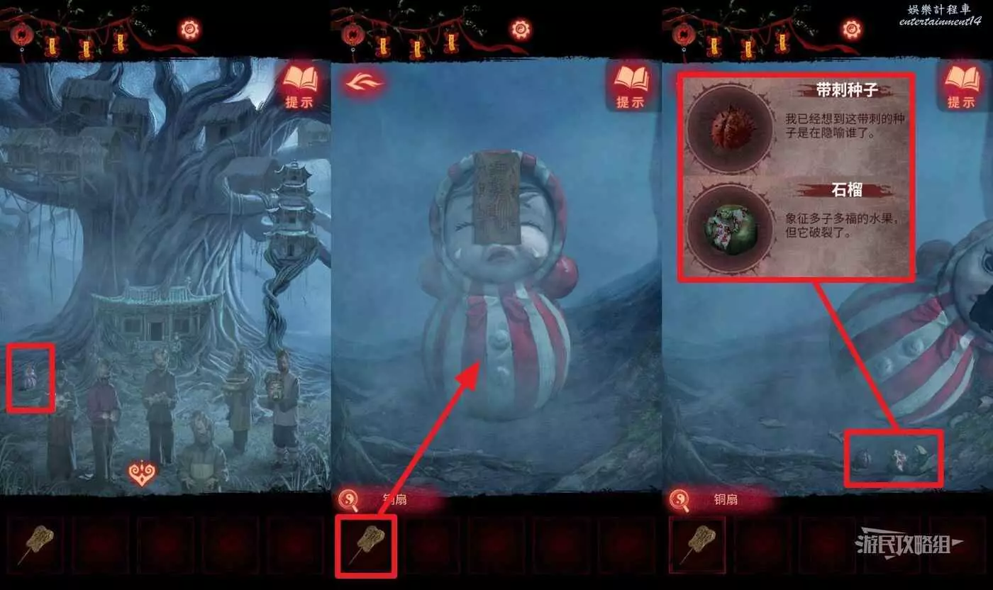 【聶莫黎視角】切換到聶莫黎視角,來到樹根區域,在樹根左側樹下之前被埋在土裡的不倒翁現在已經起來了,在道具欄選擇【銅扇】點擊不倒翁,觸發小遊戲,先看不倒翁上貼的符咒的晃動方向,然後點擊對應的方向按鍵晃動不倒翁,嫌麻煩可以跳過。完成小遊戲後獲得【帶刺種子】。