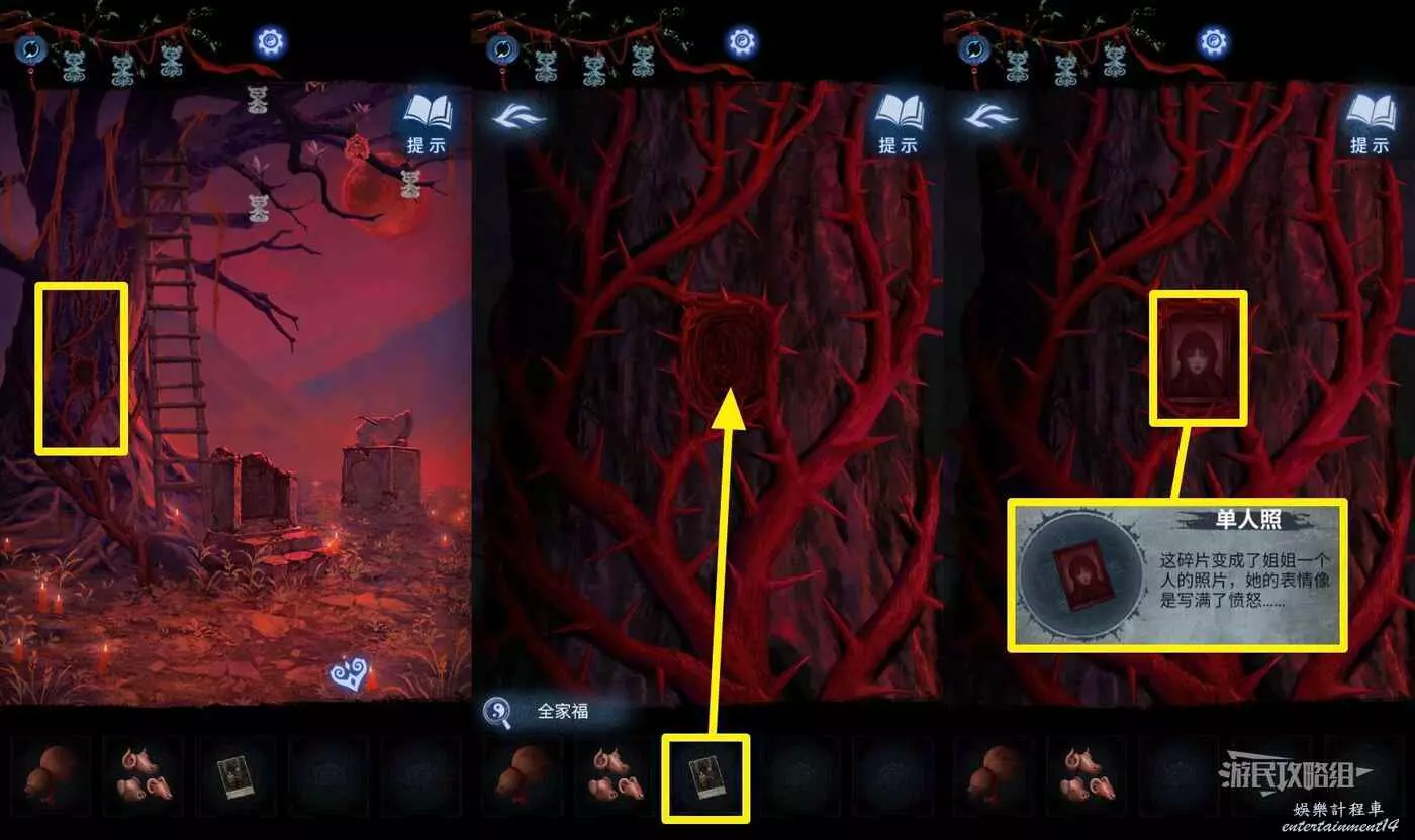 【聶莫琪視角】切換到聶莫琪視角,來到千子樹下,此時樹上長滿了荊棘。點擊樹上荊棘,從道具欄選擇【全家福】放入荊棘中間的漩渦,獲得【單人照】。