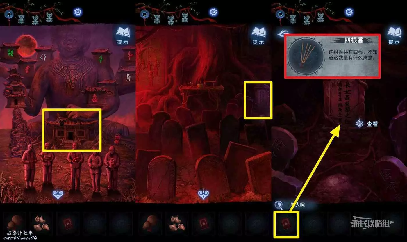 【聶莫琪視角】來到六葬雕像區域,點擊雕像正下方的廟,然後點擊畫面右側的聶莫黎墓碑,在道具欄選擇【單人照】放在墓碑前,土包上會出現4根香,拾取【四根香】。