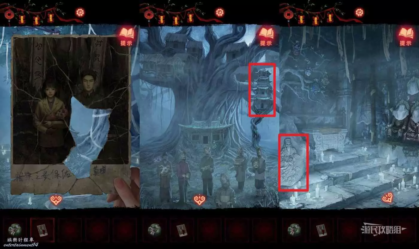 【聶莫黎視角】切換到聶莫黎視角,來到千子樹樹幹區域,觸發劇情,獲得殘缺的全家福,切換到樹根區域,點擊樹根正下方的廟,進廟之後點擊左側的石雕。