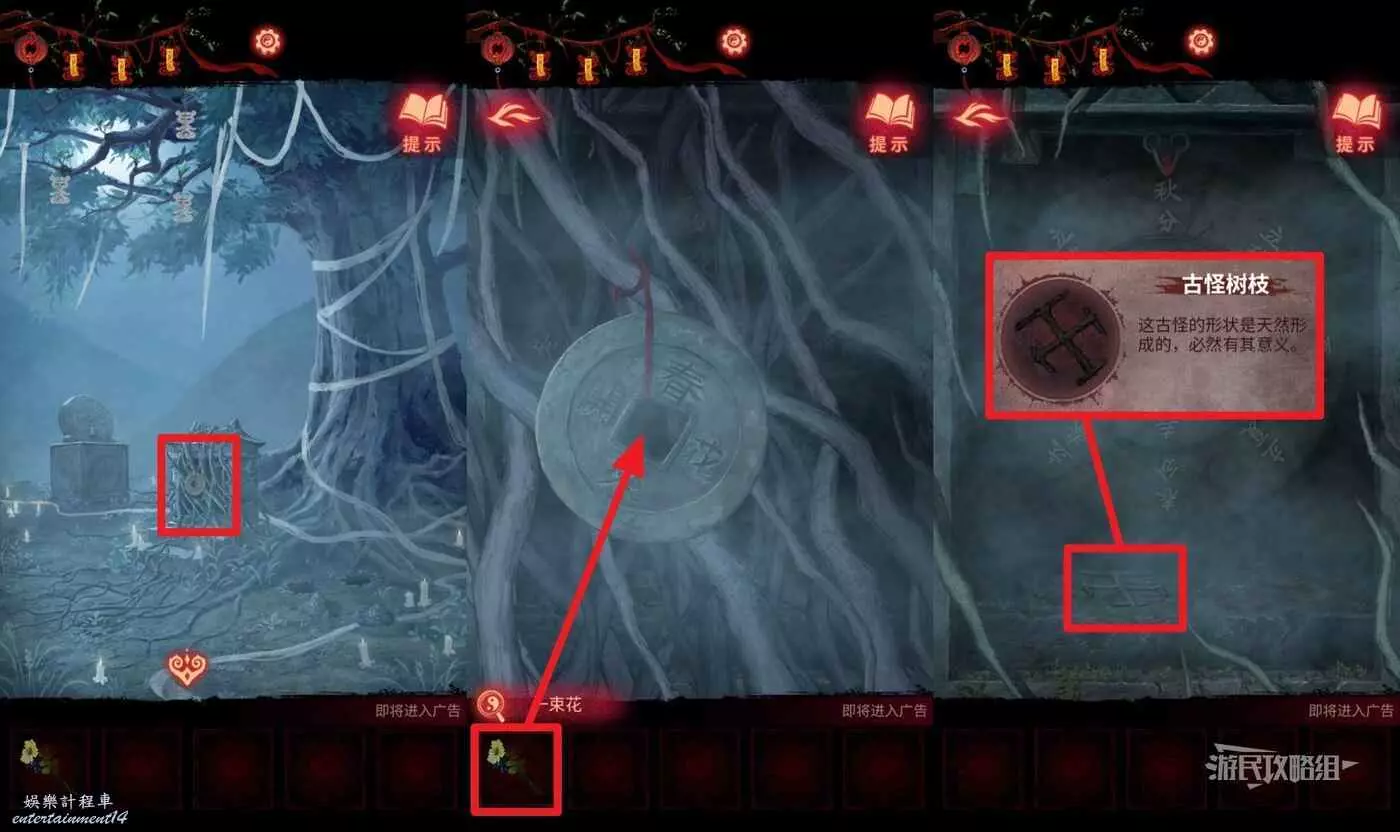 【聶莫黎視角】回到樹幹區域,點擊畫面中間的銅錢,在道具欄選擇【一束花】放在銅錢中,解鎖轉盤,在轉盤下方拾取【古怪樹枝】。