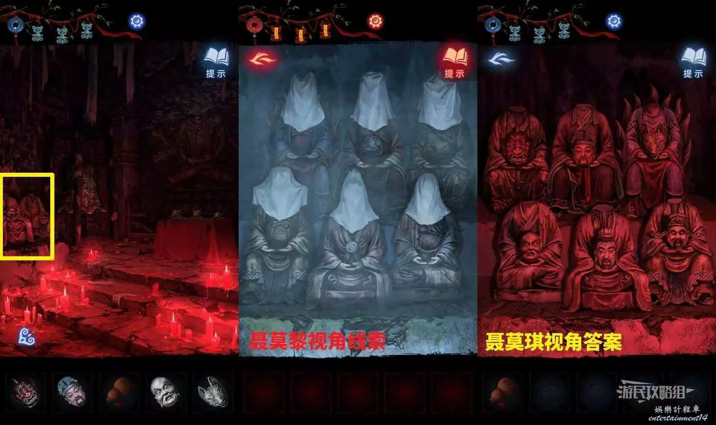 【聶莫黎視角】切換到聶莫黎視角,進入樹根區域正下方的廟,點擊右上角的浮雕獲得甲骨文位置線索,根據之前的六葬雕像甲骨文顏色線索,開始解開蠟燭顏色謎題。