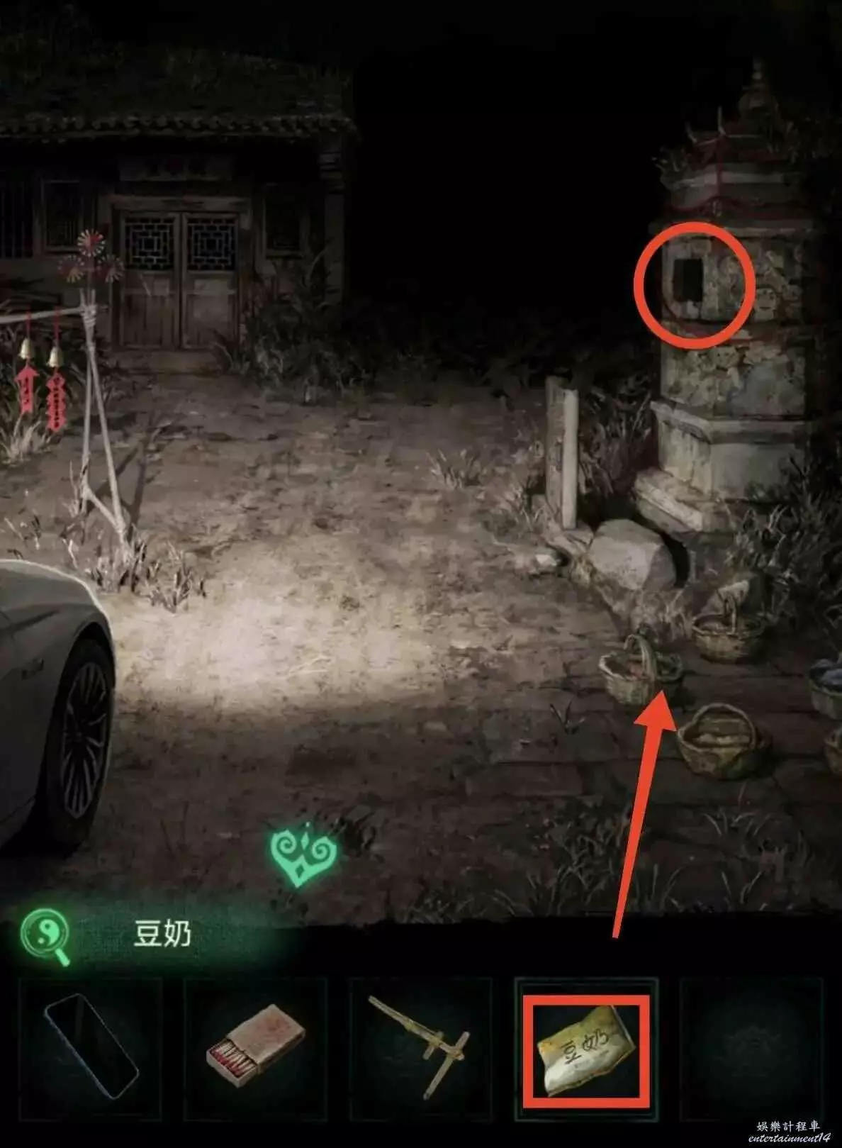 回第一個場景的小塔,打開手機,可以看到一個娃娃,把豆奶丟給他,得到門神貼紙。