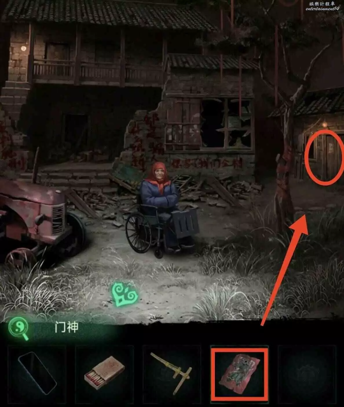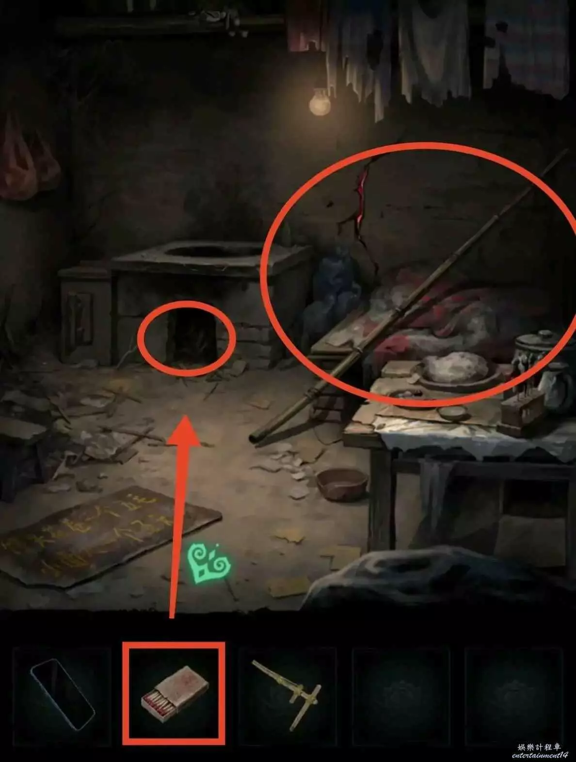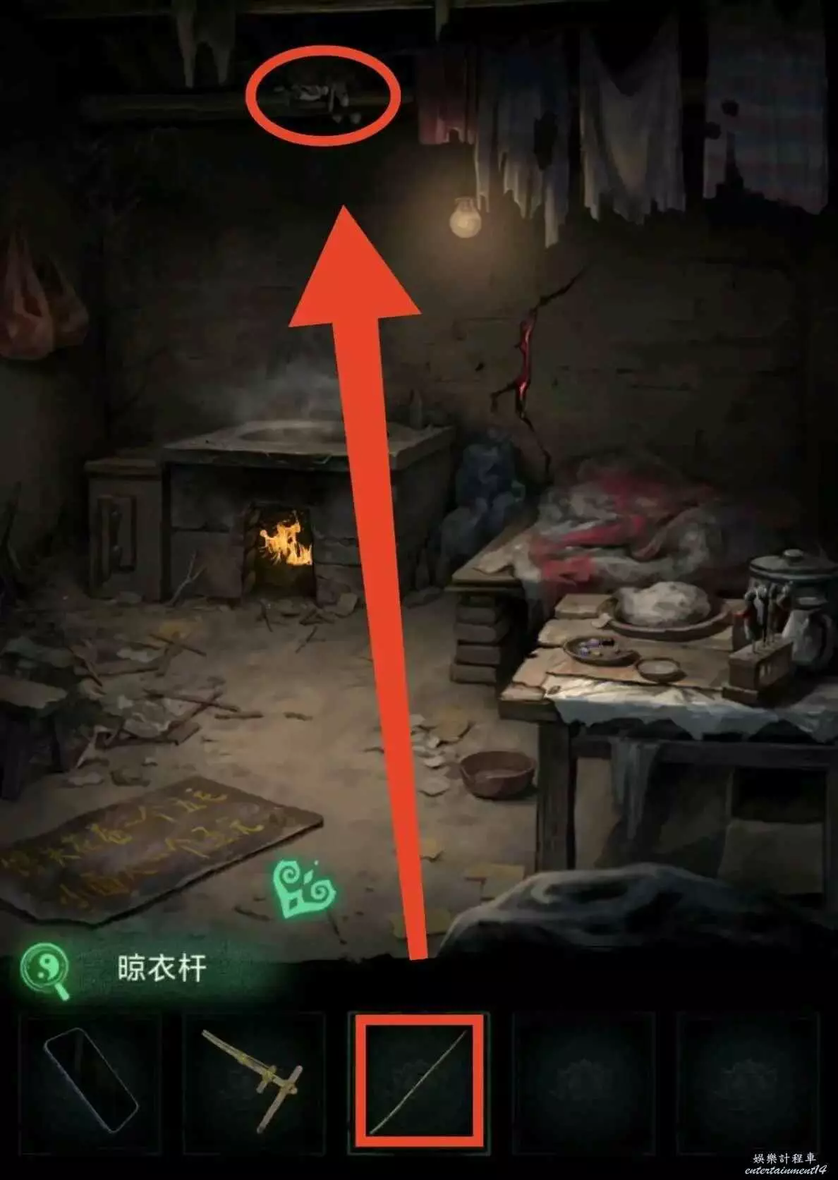 3、把另一邊的門神給貼上,進門先拿晾衣杆,用火柴把爐子點著,按照線索1推動風機增大爐火,用晾衣杆把房梁上的娃娃篤下來,獲得釘子和石片。