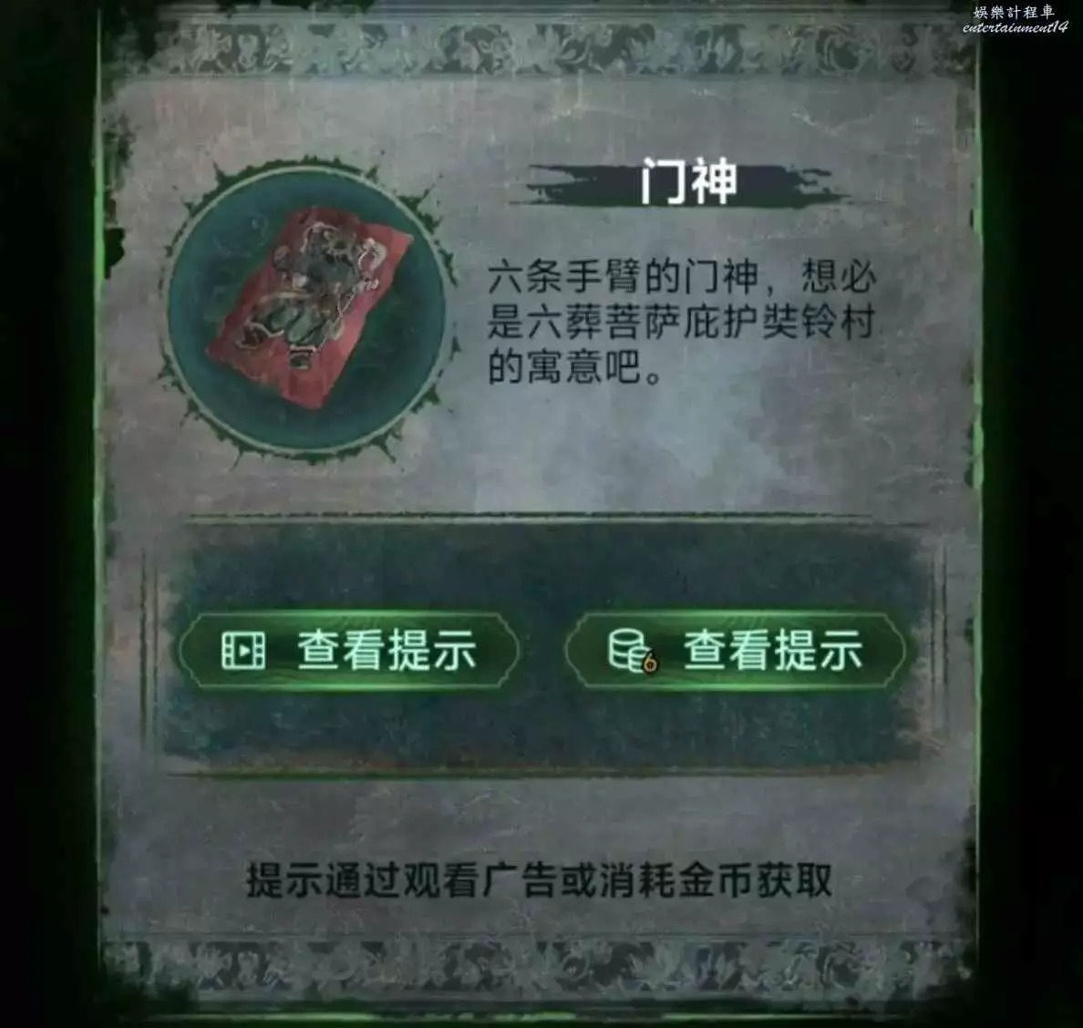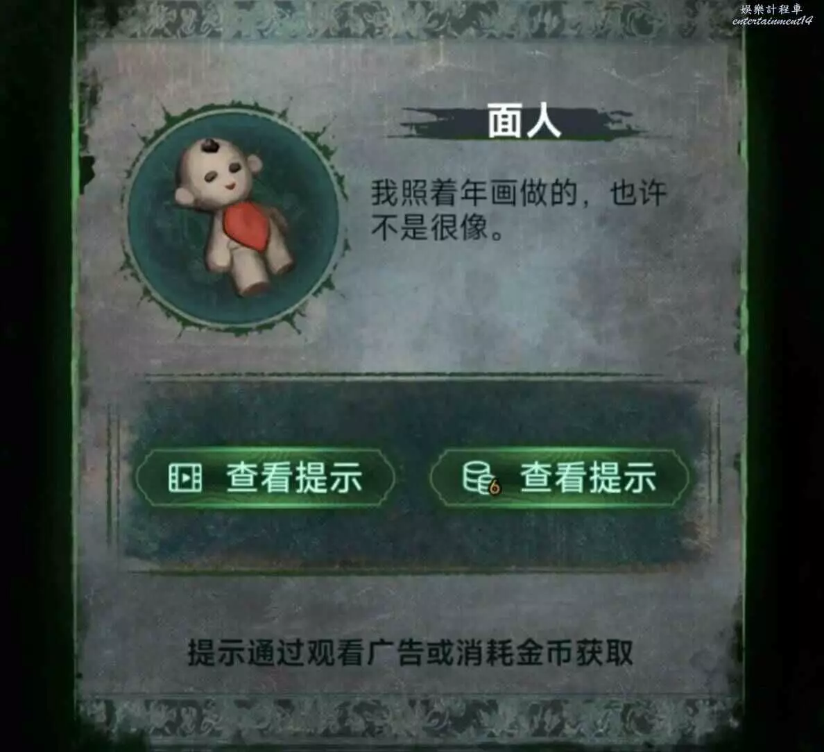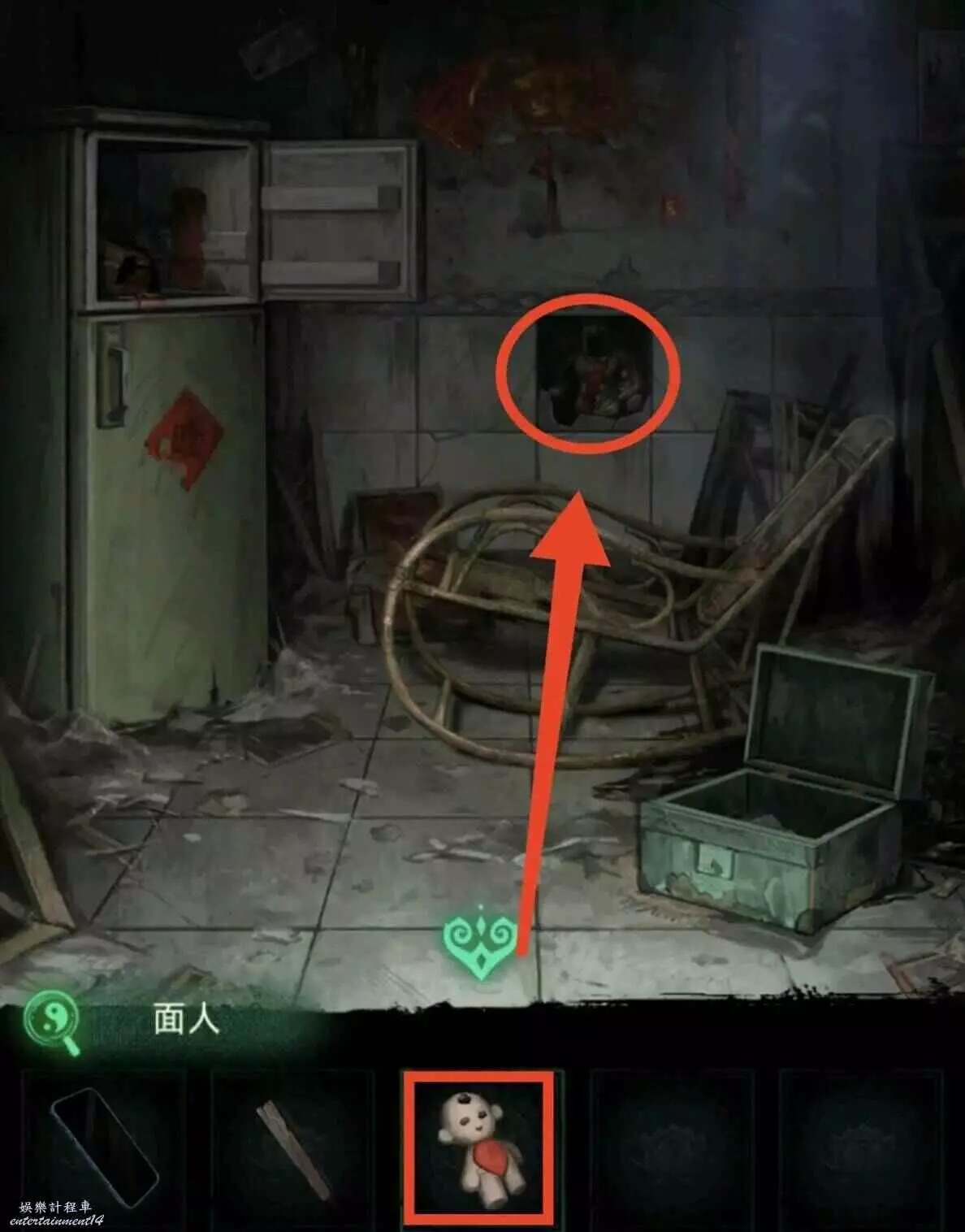 3、把另一邊的門神給貼上,進門先拿晾衣杆,用火柴把爐子點著,按照線索1推動風機增大爐火,用晾衣杆把房梁上的娃娃篤下來,獲得釘子和石片。
