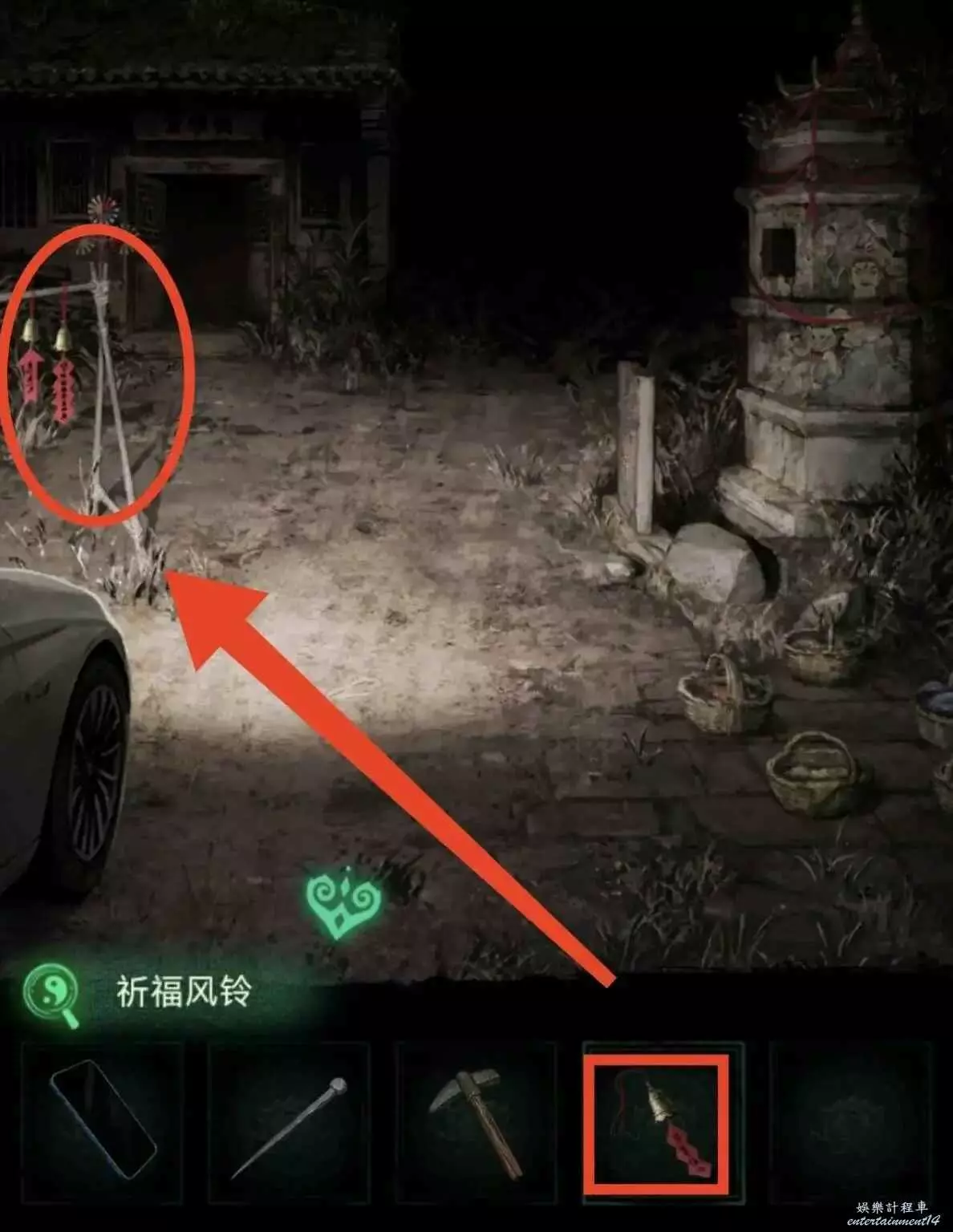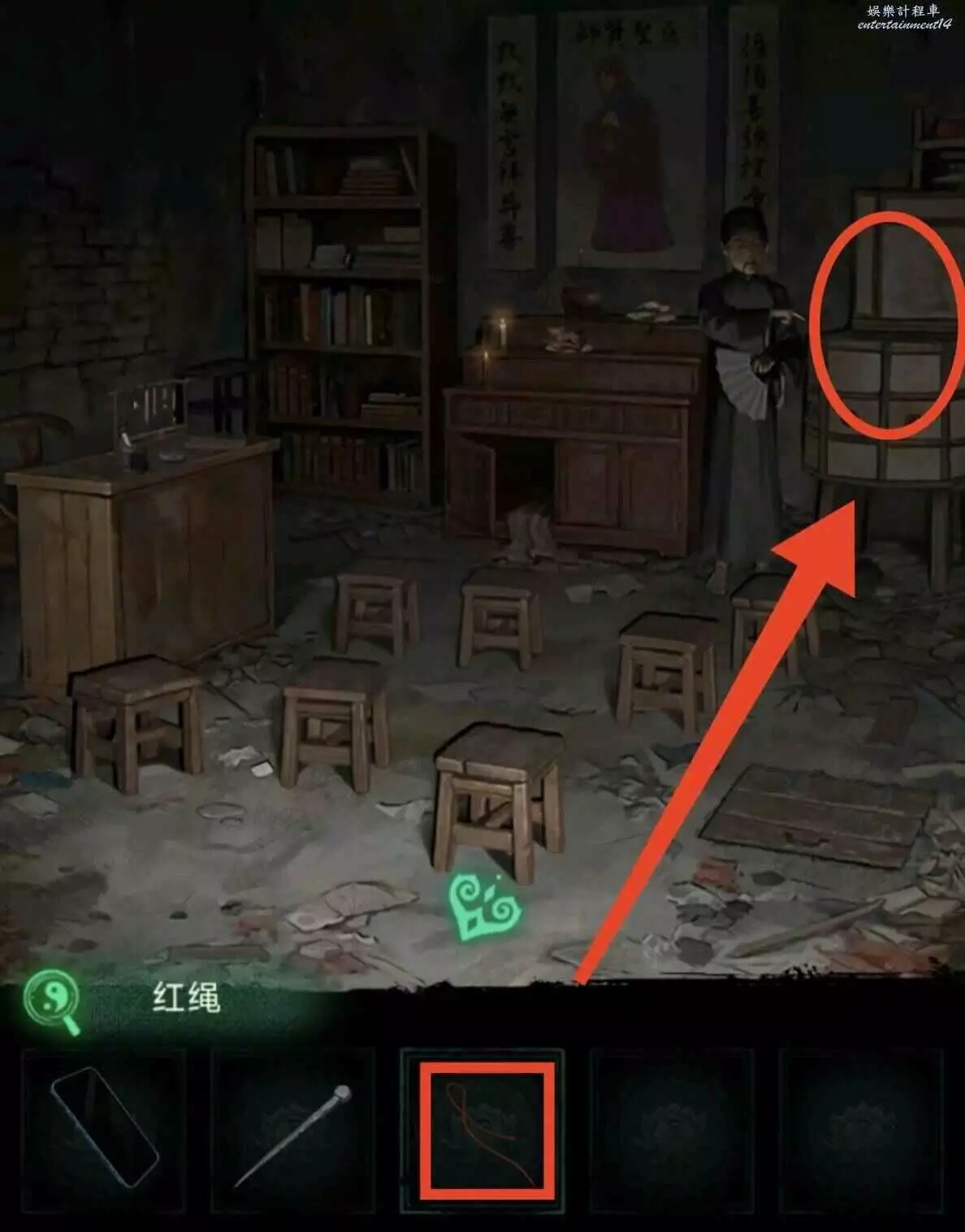 6、用尺子把裂縫中的紅繩勾出,去學堂把斷掉的繩子接上,獲得線索3及榔頭。把線索2和線索3合併,解出書案答案如圖所示,獲得風鈴。