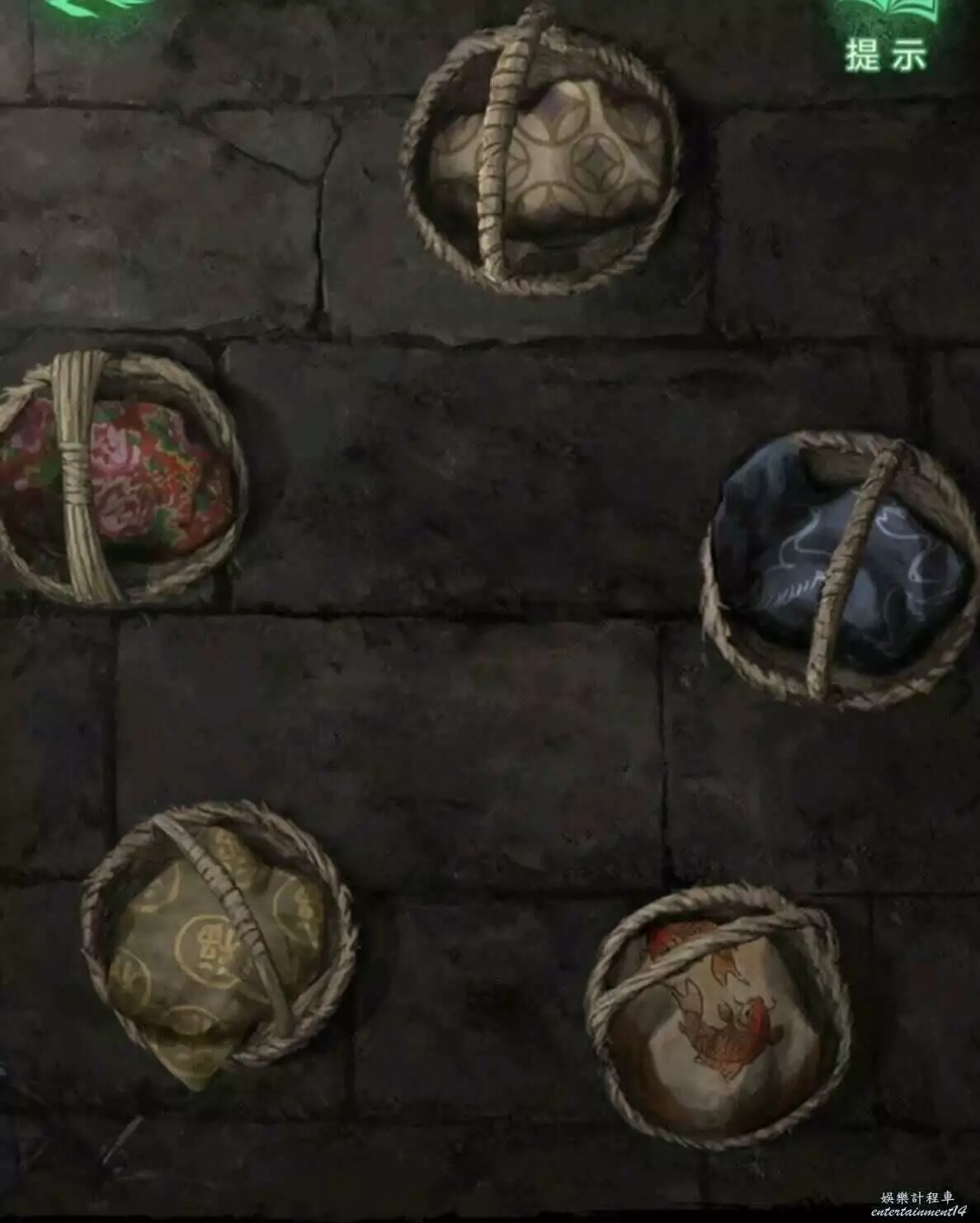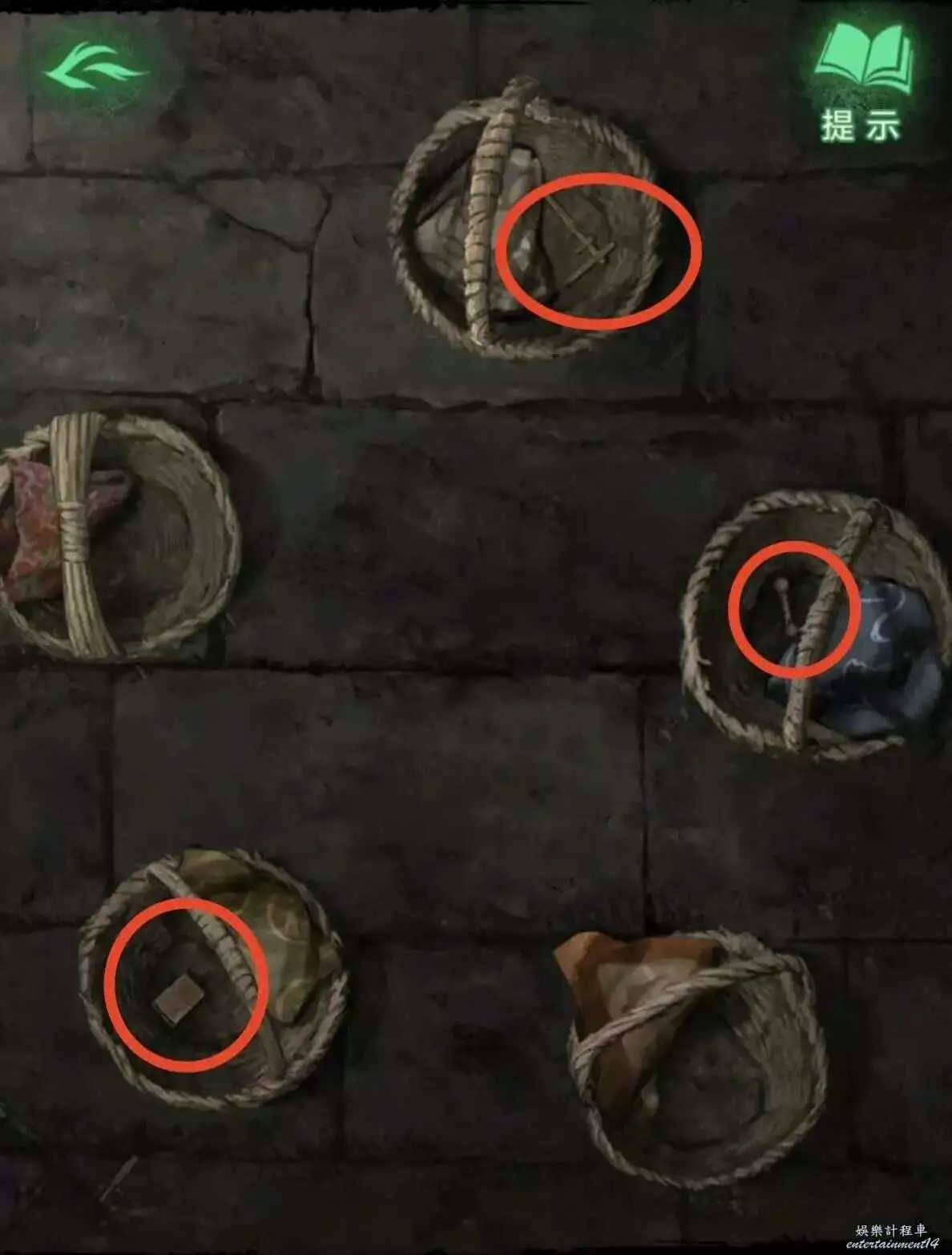 1、開局能互動的只有右邊的籃子,很簡單按照地上的圖案擺放就好,如圖2。完成後掀開得到三個道具。