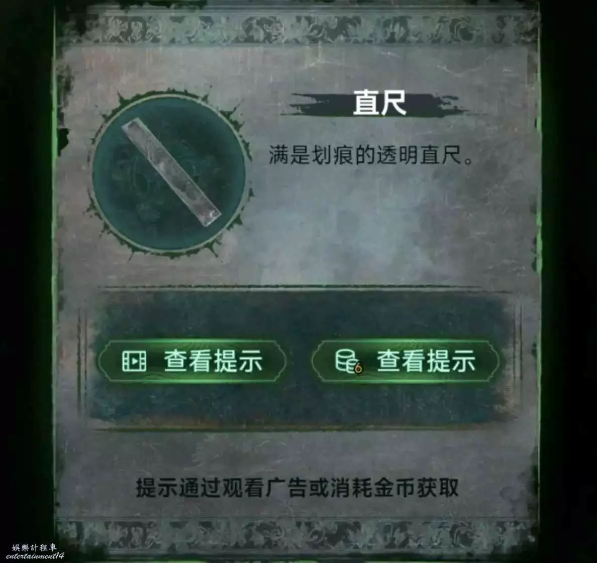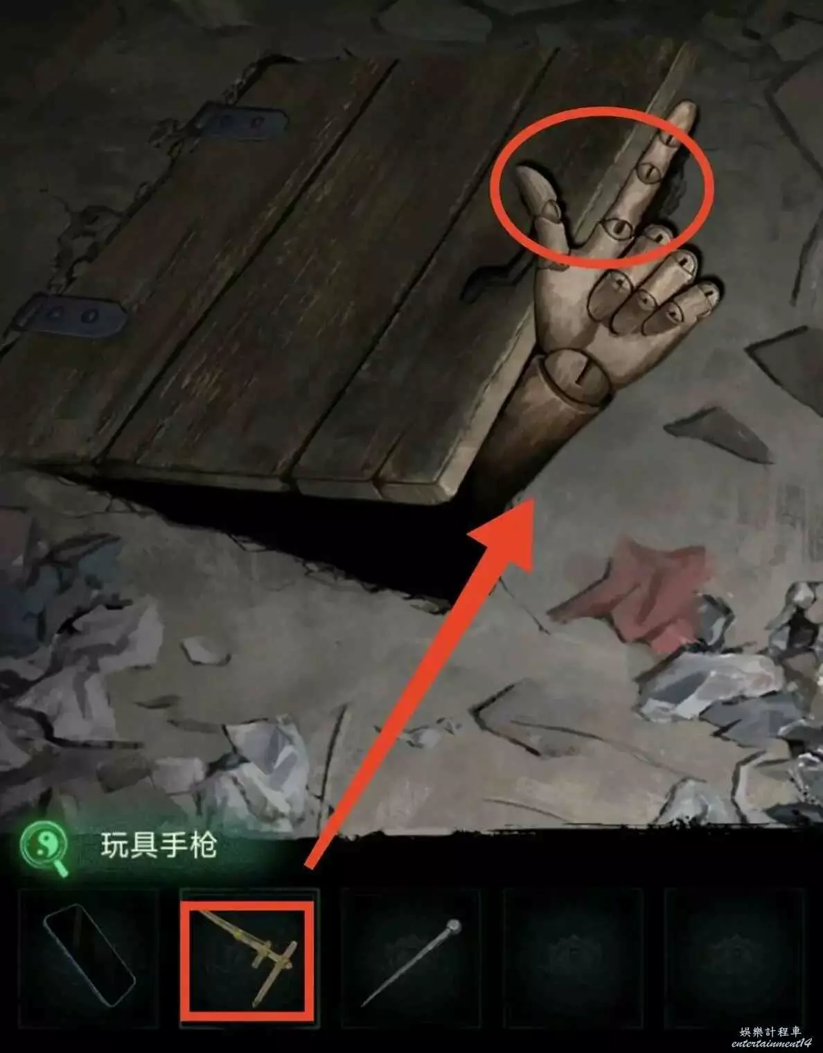 5、進門先點書架,會掉出來線索2,然後打開地下蓋板,木偶會伸手出來,意思是讓你把槍給他,他會還你一把尺子。