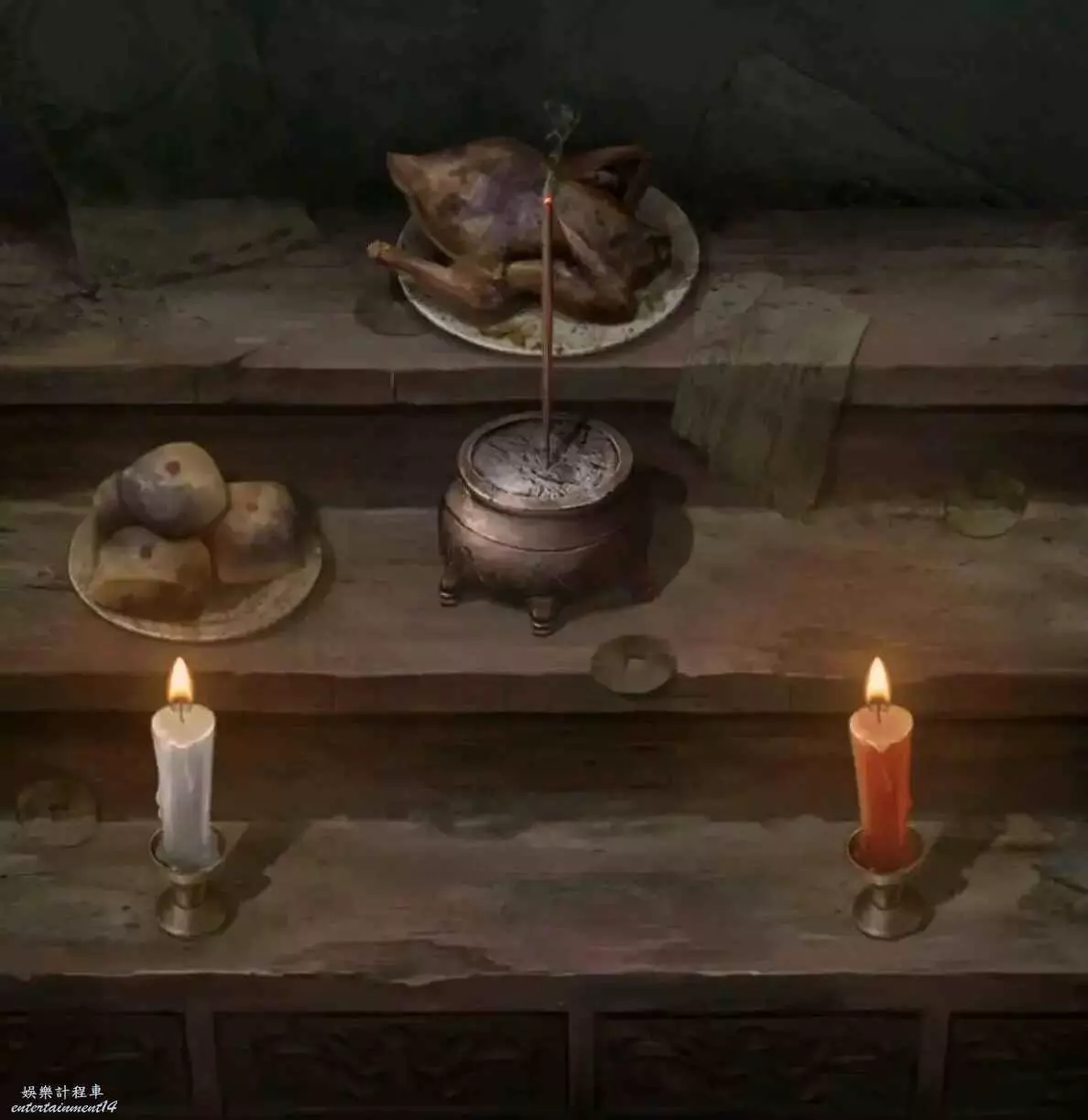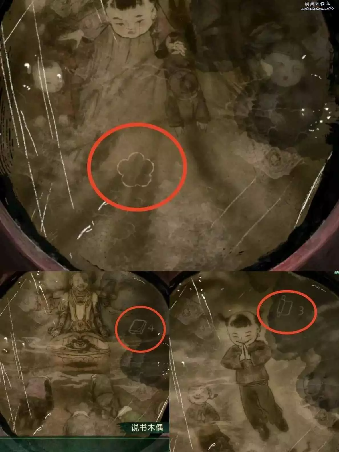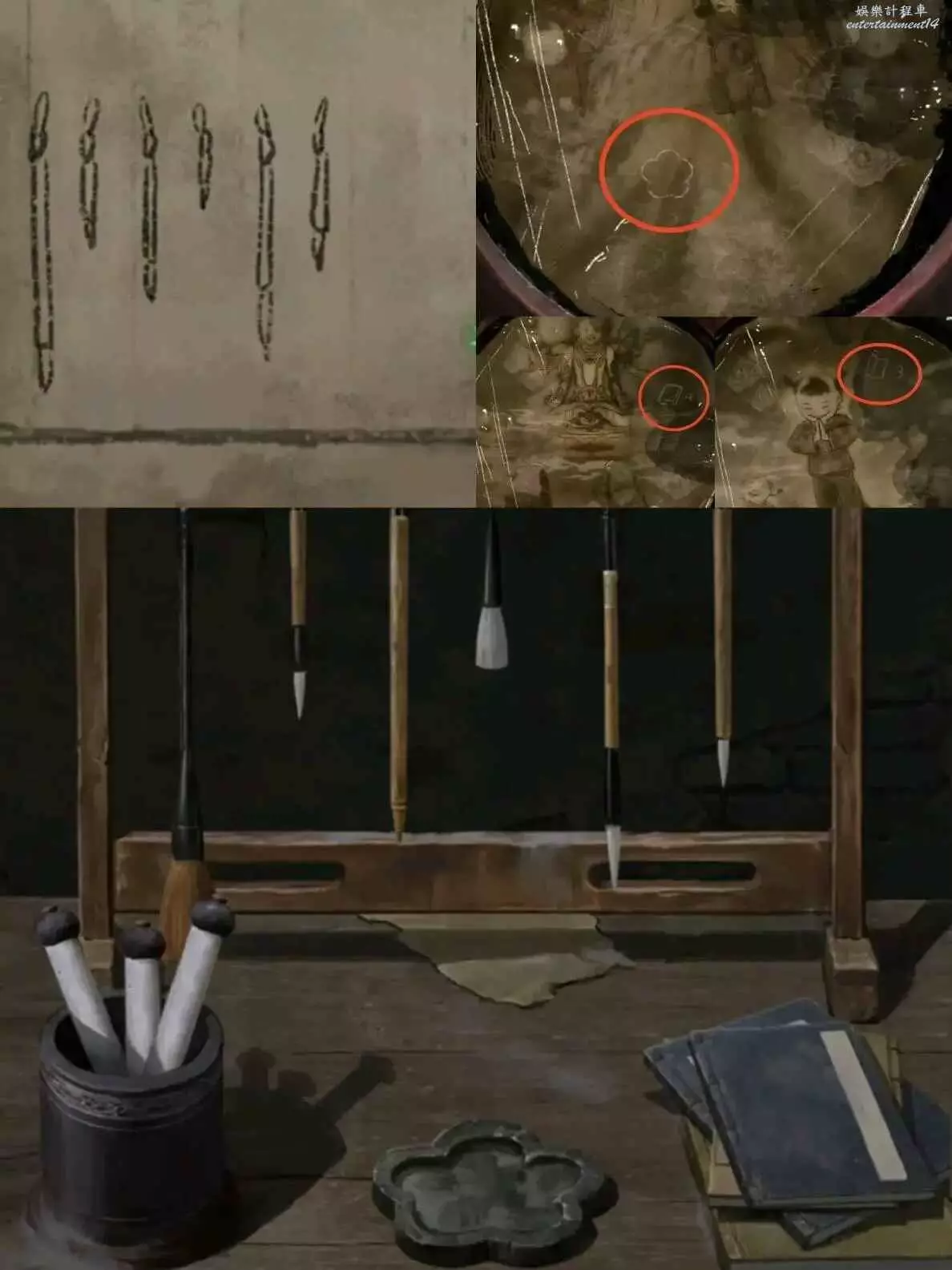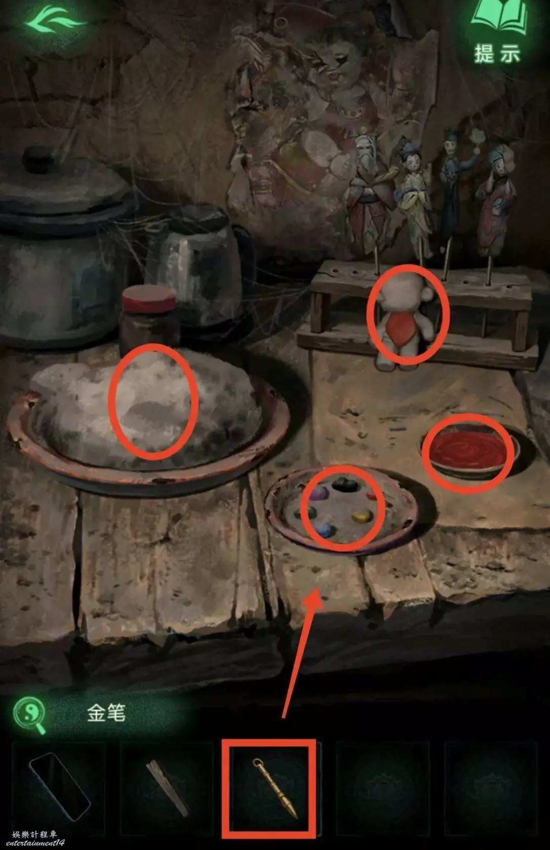9、在學堂按照線索6擺放如圖,獲得金筆。回去廚房,朱砂倒小碟子上,直接用手捏飯糰捏成小人(也是當上一次女媧了),然後用金筆給小人上色,獲得面人。