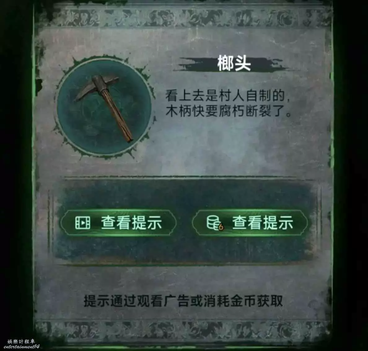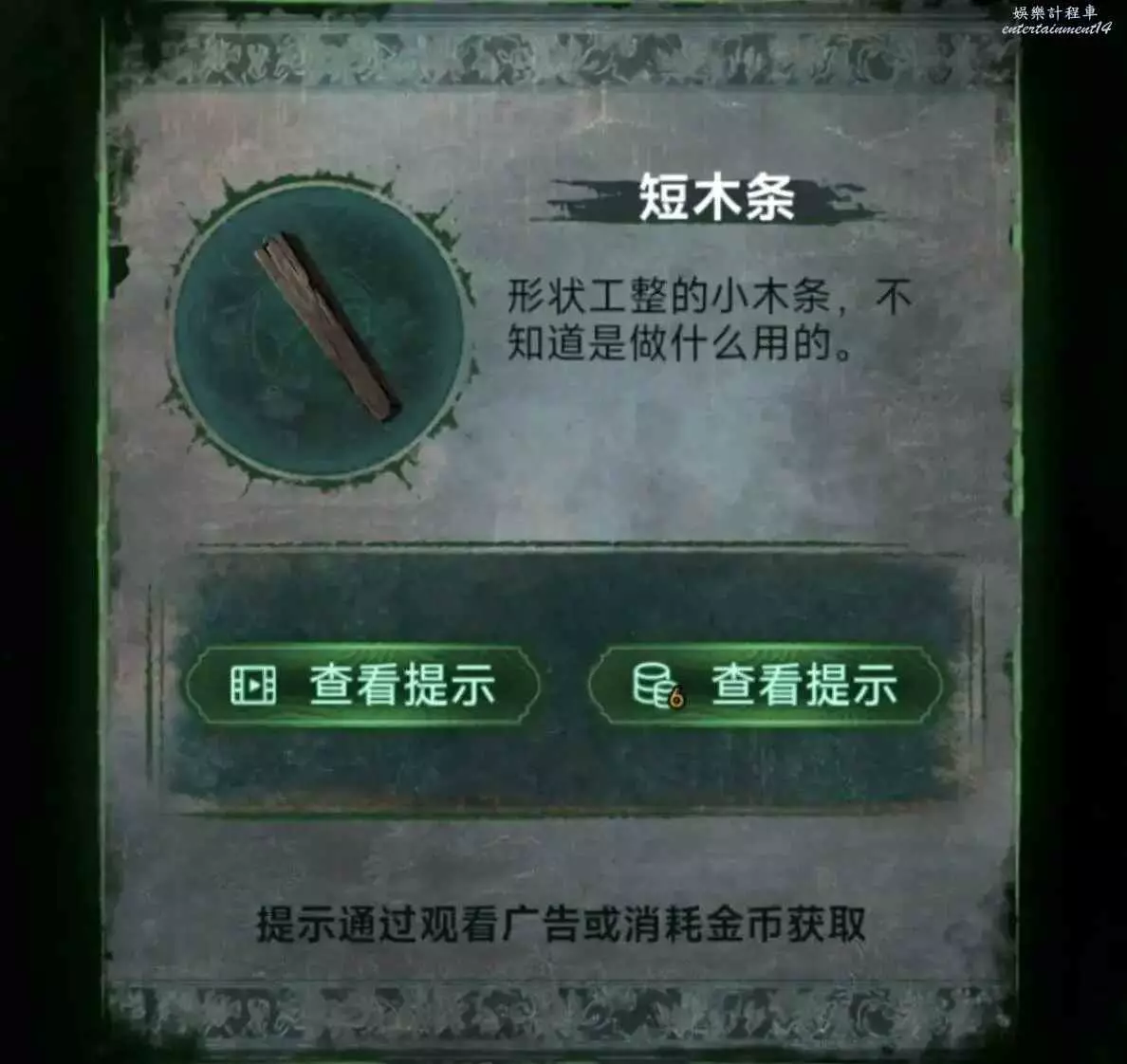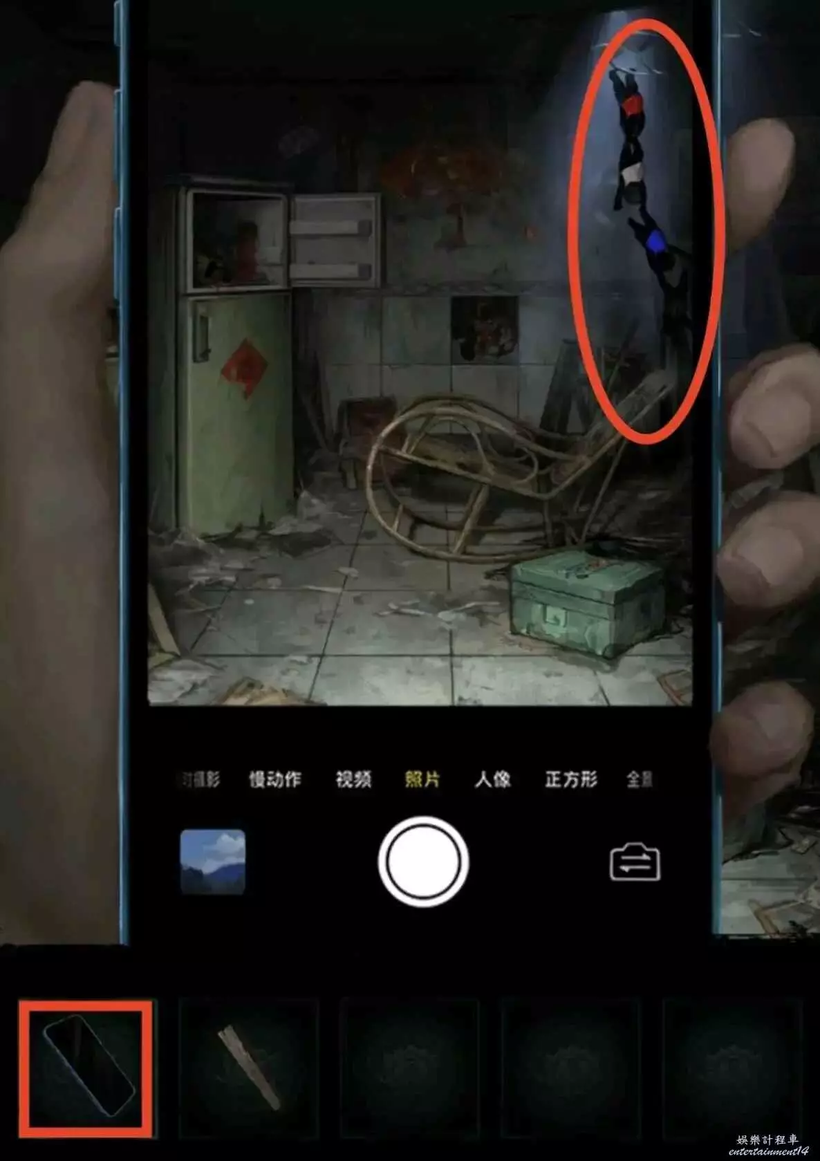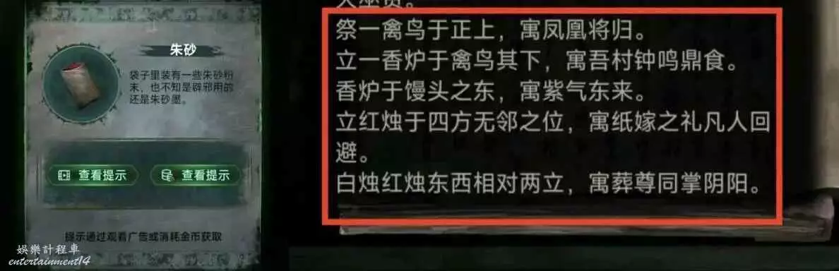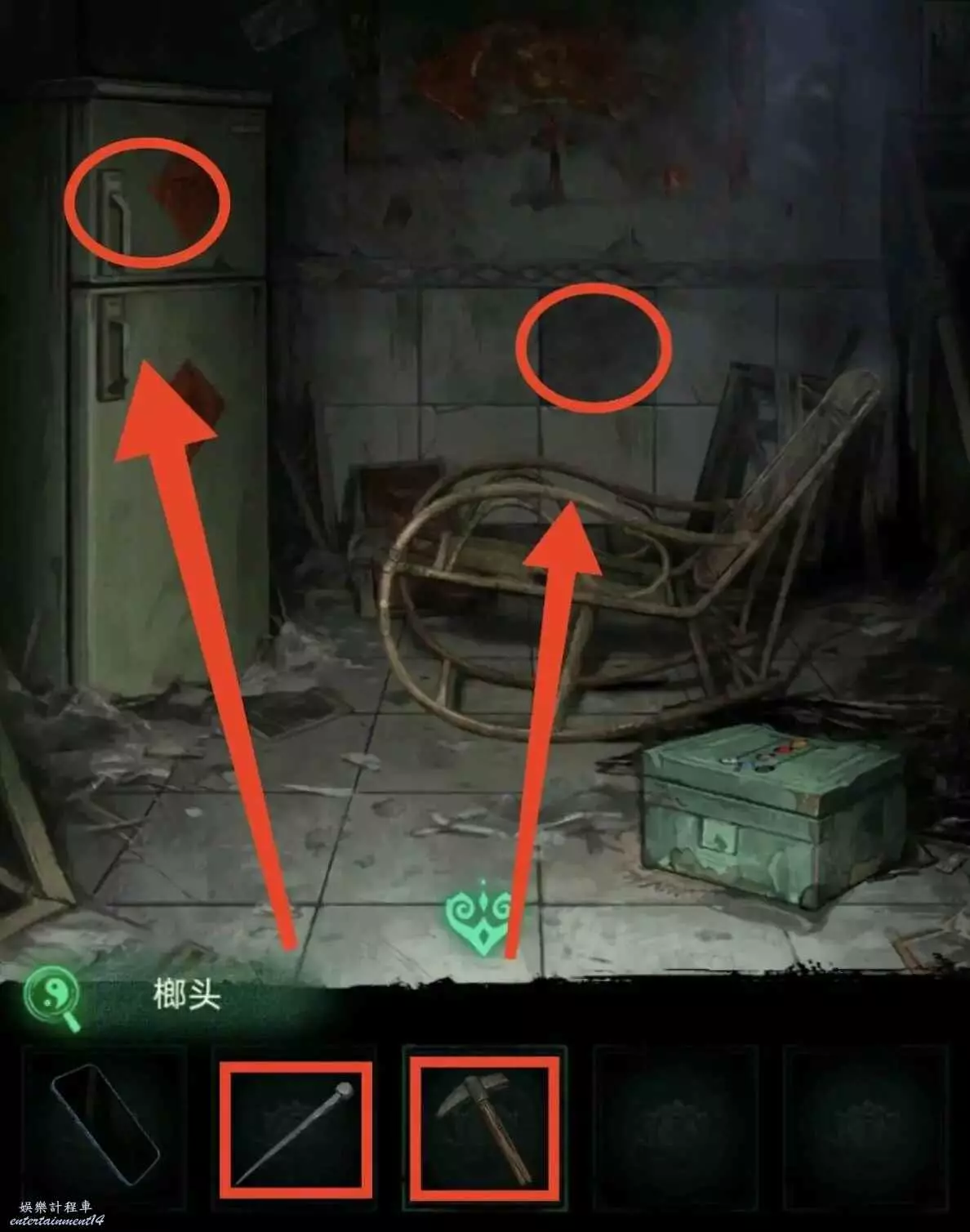 8、釘子釘住冰箱裡的小棺材,獲得木條1,順便先用榔頭砸開瓷磚,然後掏出手機獲得線索5,把線索5用在綠色的箱子上,獲得線索6和朱砂。