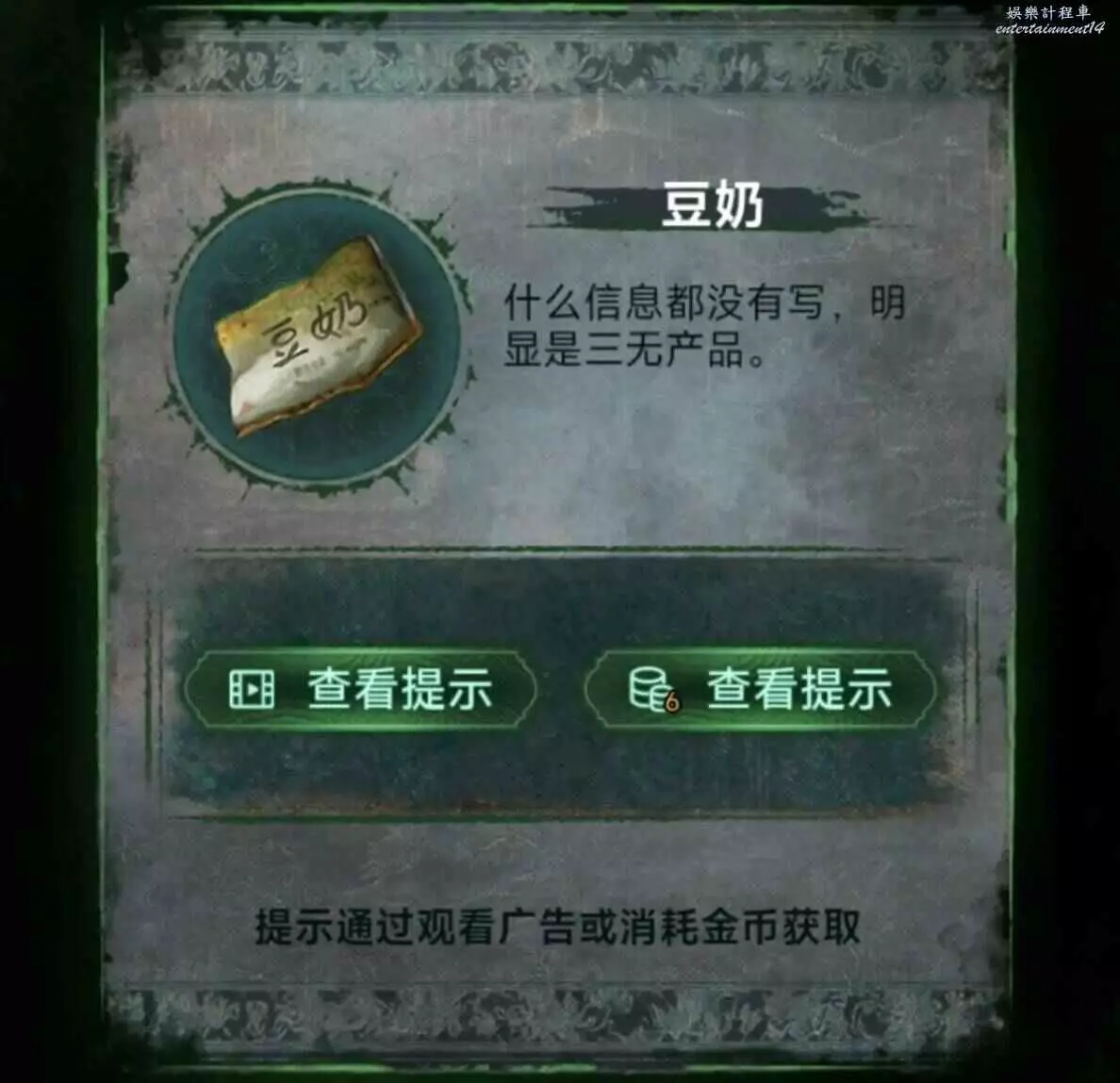 2、換場景,把口哨丟給小賣部,換到一包豆奶,打開手機可以得到線索1。