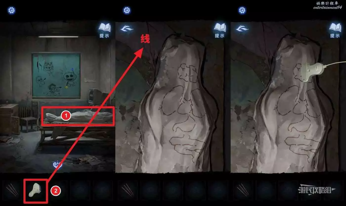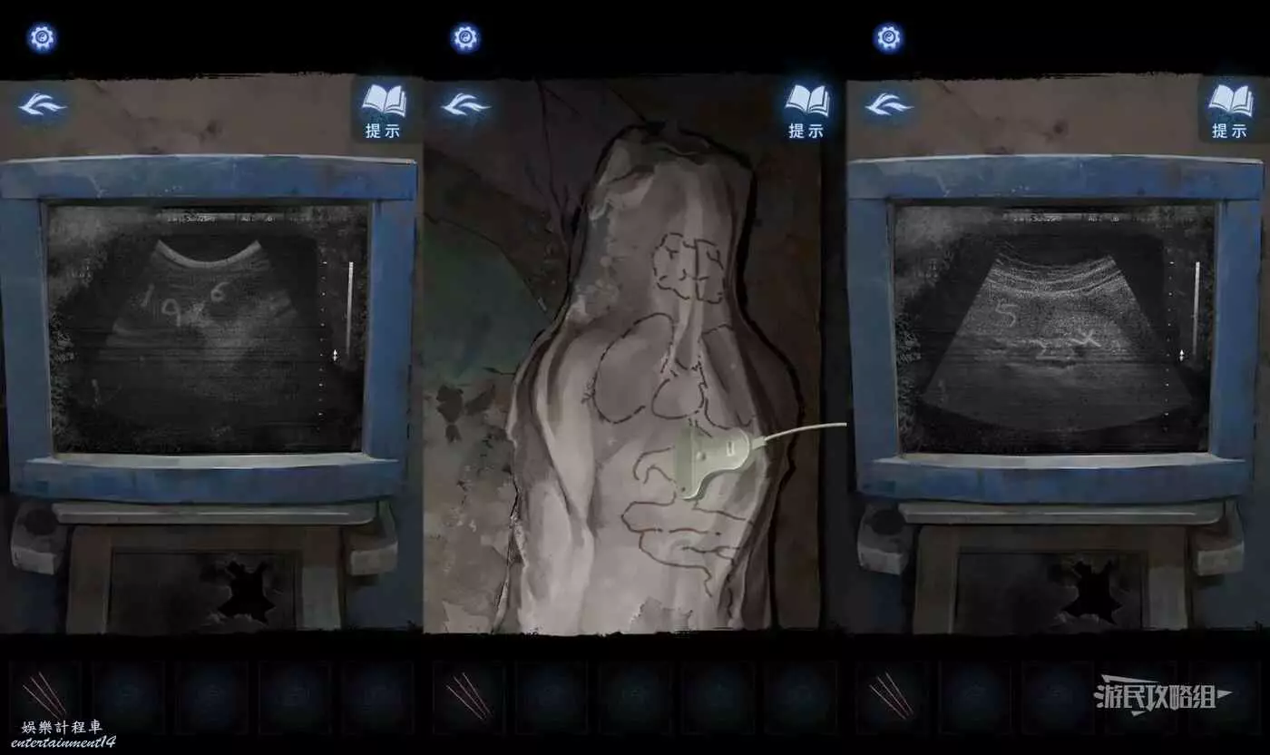 把探頭放在腦子圖案上,返回查看顯示幕,獲得密碼【196】,再把探頭移動到胃的圖案上,返回查看顯示幕,獲得密碼【524】。