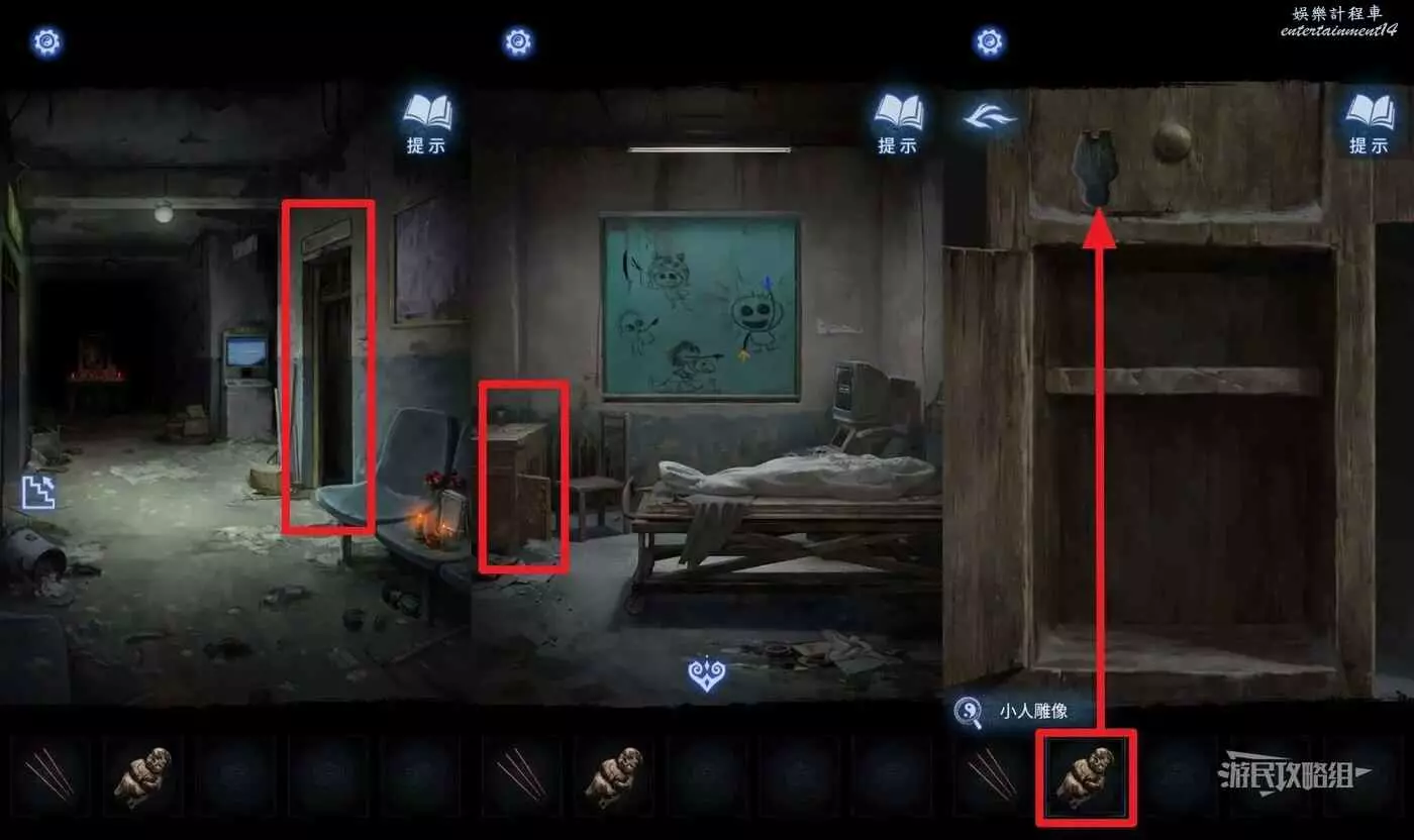 完成辦公室錦旗謎題在停屍櫃拿到布娃娃之後回到一樓,點擊椅子上的靈位,選擇道具欄中的【布娃娃】放在靈位下方,獲得【小人雕像】。