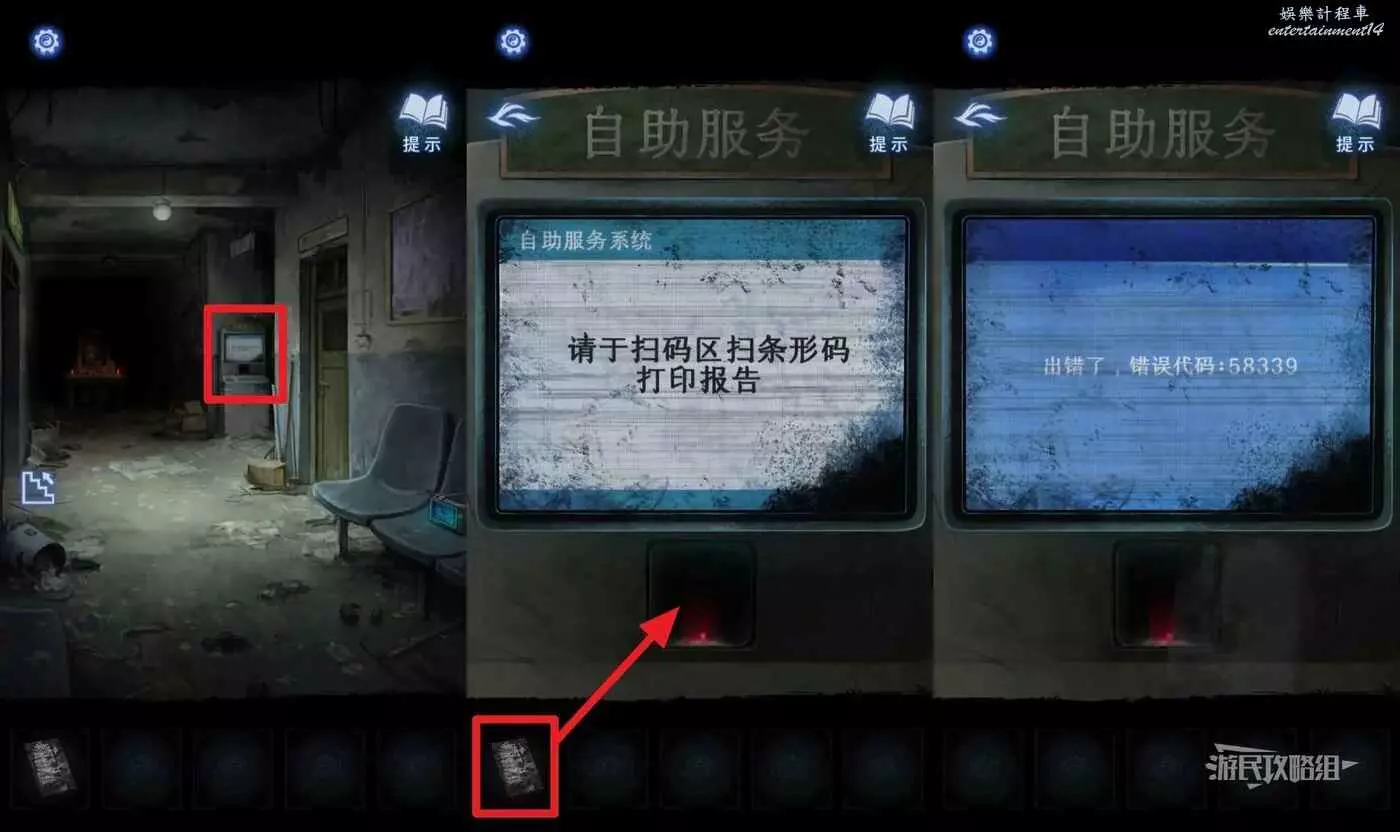 點擊走廊裡的自助服務機,選擇道具欄中的【憑條】放在掃碼區掃碼,獲得錯誤代碼【58339】。