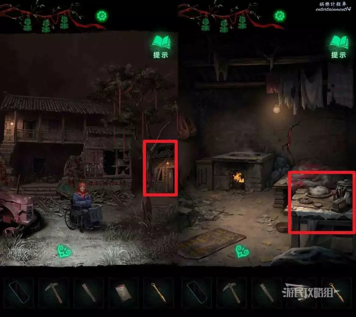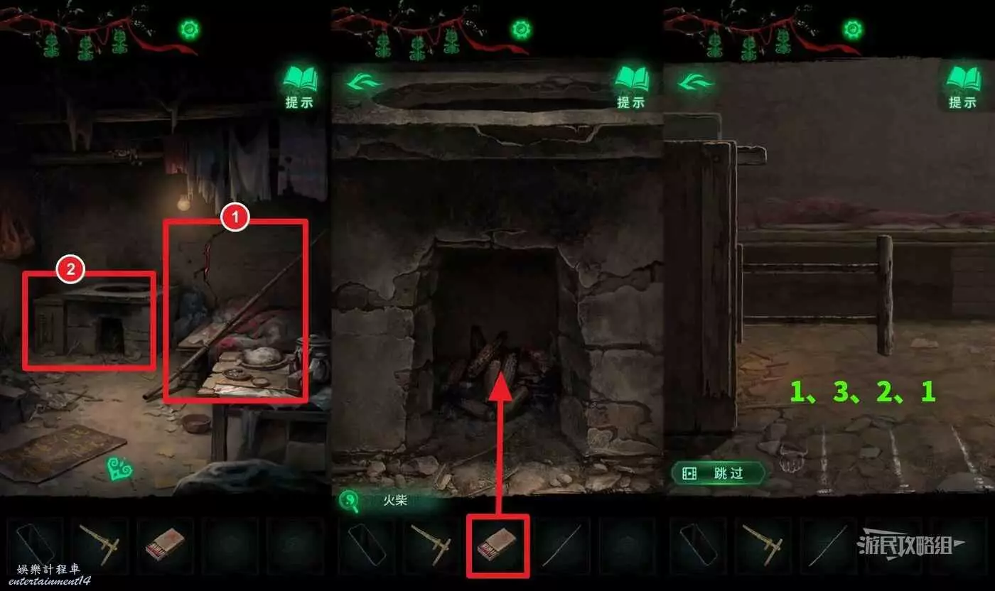 進入門神房間後,先拾取靠在床鋪上的晾衣杆,然後往左側看,有一個灶台和一個風箱,這裡需要先點灶台,在道具欄選擇【火柴】點燃灶台,然後返回再點擊灶台旁邊的風箱,按照之前在小賣部視窗用手機看到的提示拉動風箱,看地上有白色粉筆畫的標記,分別代表一、二、三,長按風箱把手,拖動到對應的標記位置後鬆手,視為拉動了一下,依次將風箱把手拉到一、三、二、一的位置,讓火生的更旺。