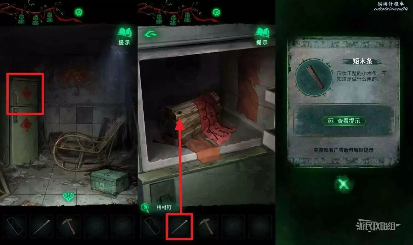 進入村口二樓房間後,點擊左側綠色冰箱,在道具欄選擇【棺材釘】放在木棺上,再次點擊木棺,獲得【短木條】。