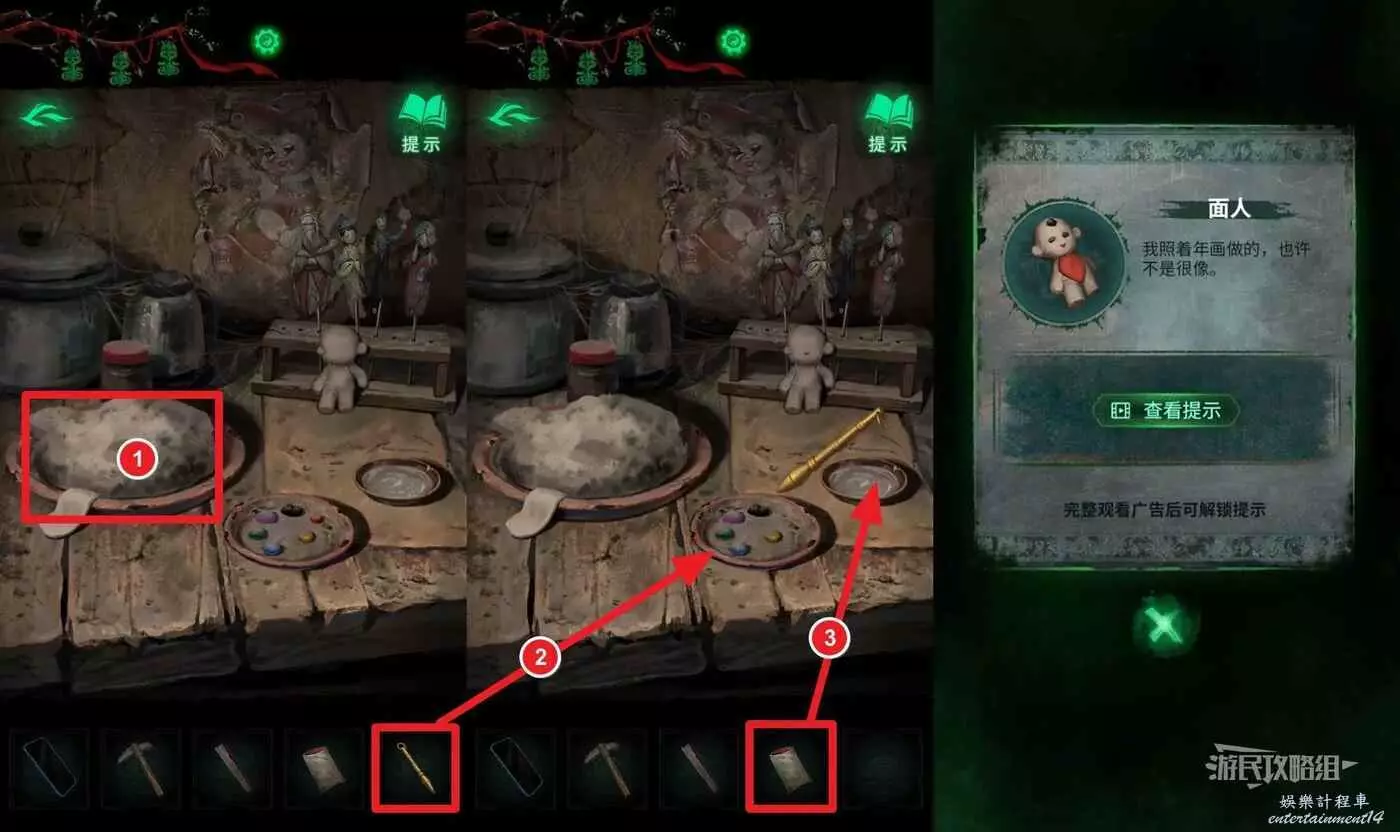 先點擊左側麵團獲得面人,然後在道具欄選擇【金筆】(解開供台謎題獲得),點擊桌子中間的調色盤,再選擇道具欄中的【朱砂】(解開綠盒娃娃頭謎題獲得)點擊桌子右側的水盤。獲得【面人】。
