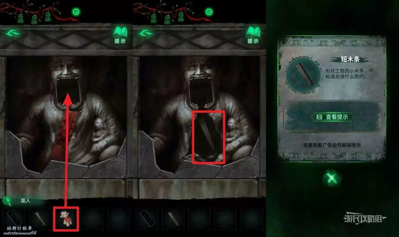 敲碎瓷磚後,選擇道具欄中的【面人】放入瓷磚後雕像的嘴裡,拾取【短木條】。